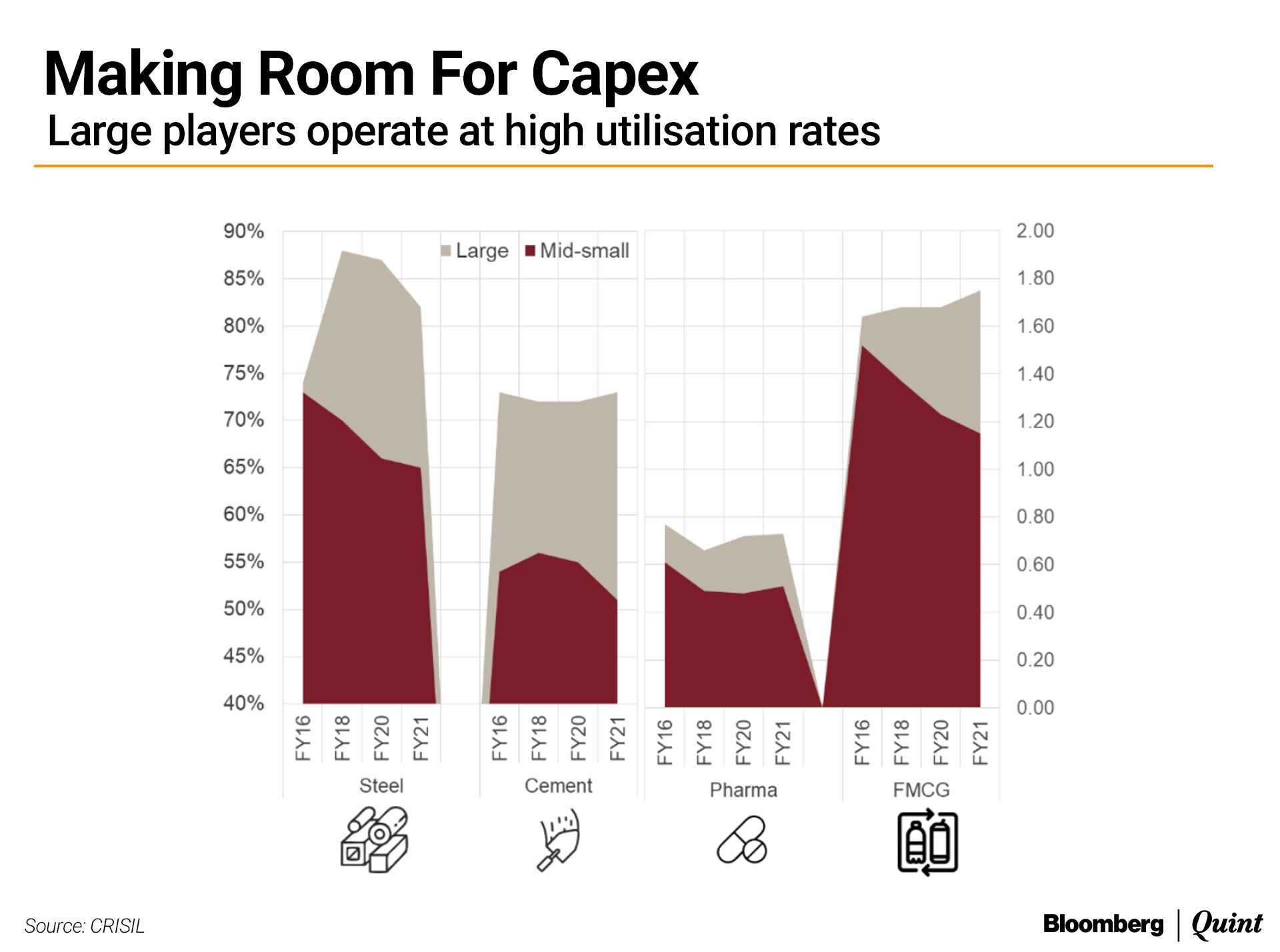 "Large firms in core industrial sectors (steel and cement) as well as consumption sectors (fast-moving consumer goods or FMCG and pharma) have gained significant market share over the past few years, especially during the pandemic, necessitating further investments," Crisil said.