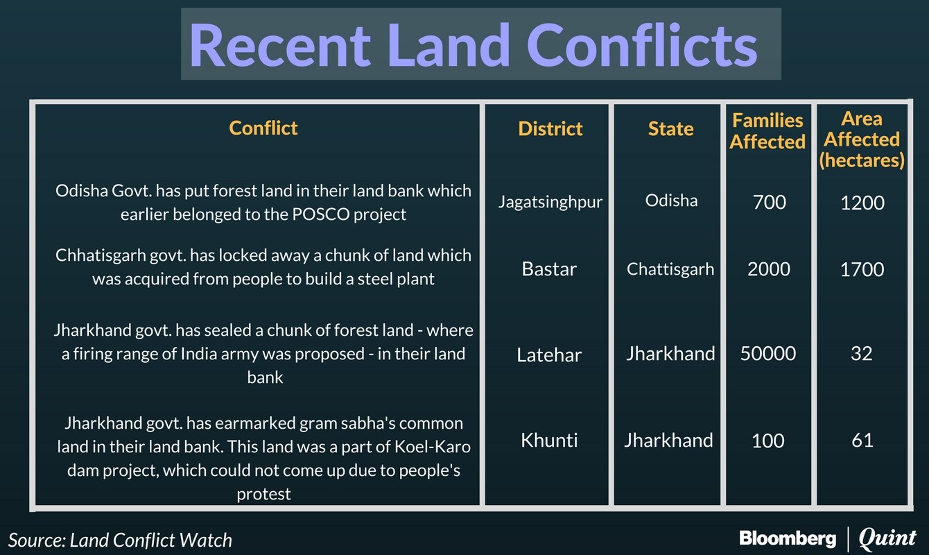 In several cases, this has been done at the cost of people's rights: Delhi-based data journalism initiative Land Conflict Watch has documented four recent cases including Nuagaon that together involve more than 3,550 hectares of land and affect 2.58 lakh people - more than the population of Nagaland. These conflicts have arisen because state governments have banked land that was allotted for industrial and infrastructure projects that were shelved due to local opposition. Instead of resolving the conflict, the states just locked the land away.