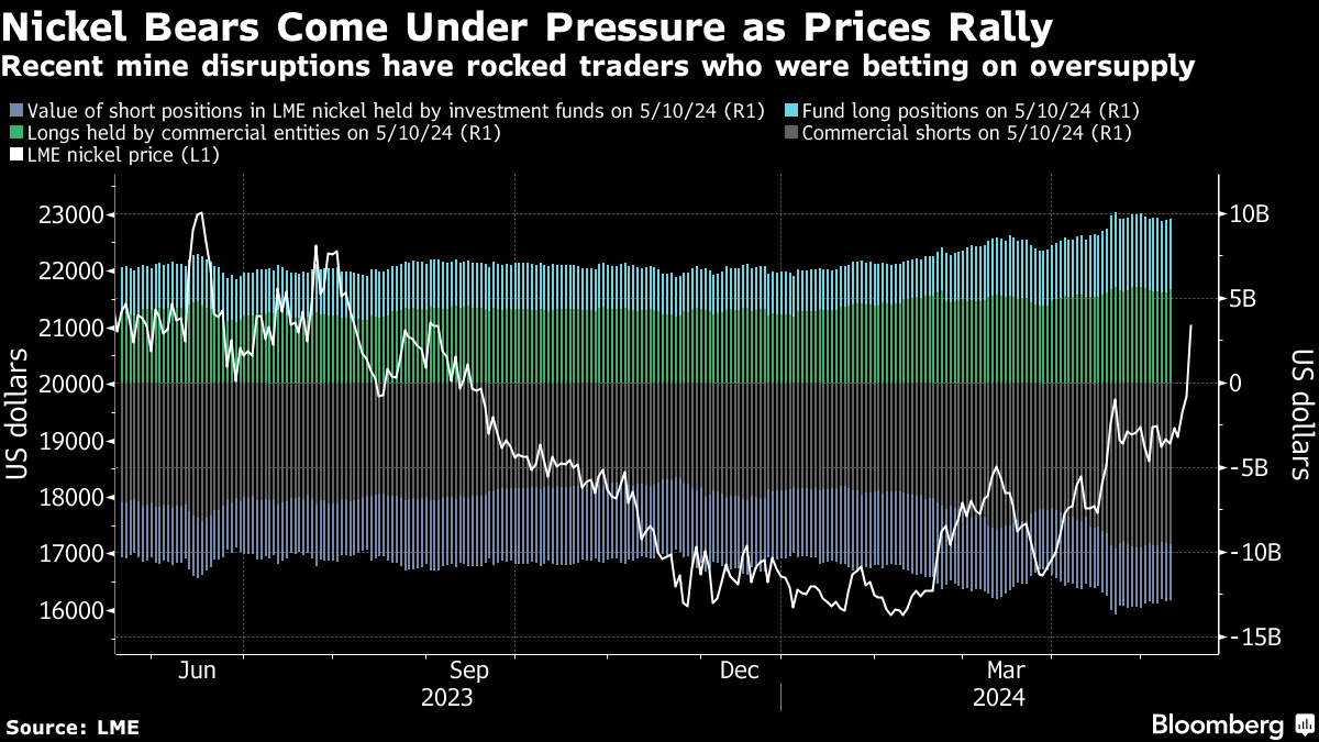 Disruptions to supply have caught many traders off guard, helping to fuel outsized moves as holders of short positions have raced to close out their contracts. Nickel prices spiked as much as 7.9% on the LME on Friday after violent protests broke out in New Caledonia, the world's third-biggest supplier.