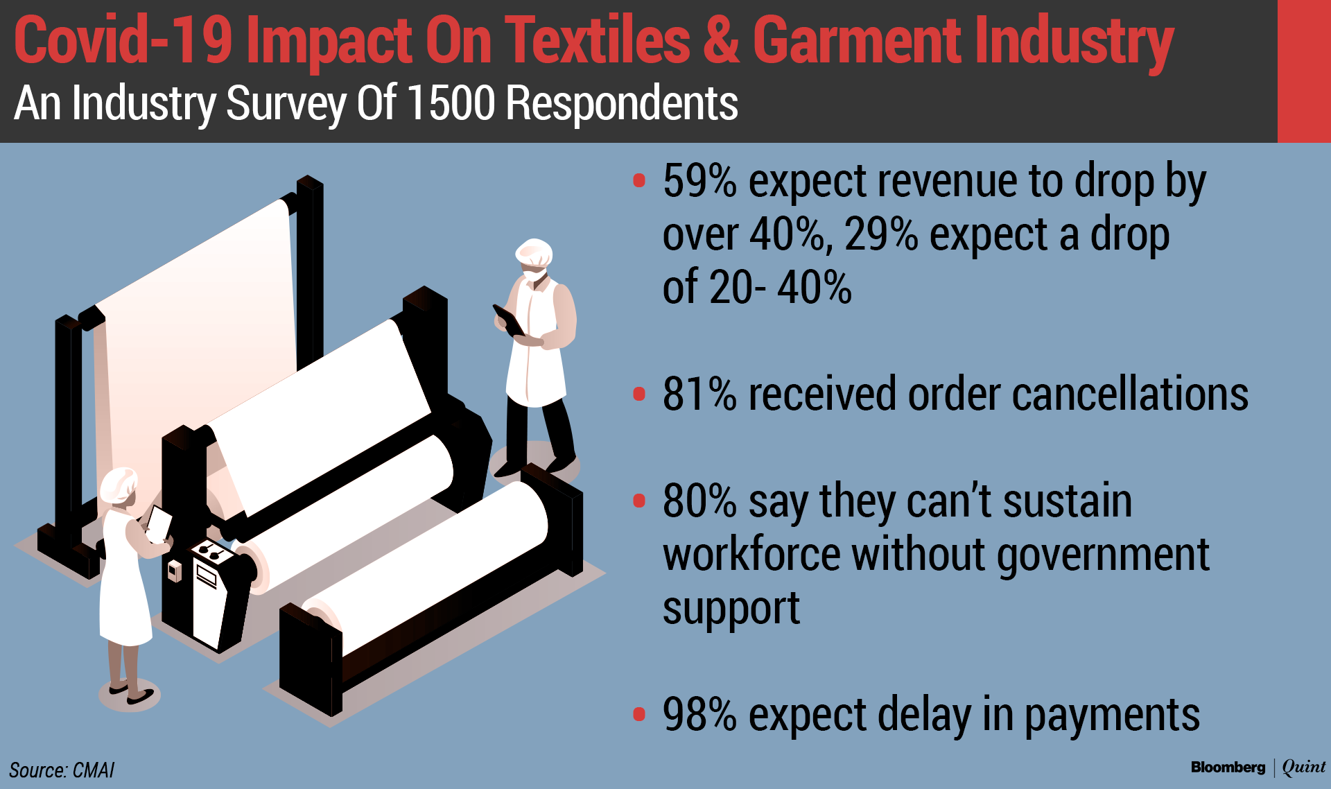 His sentiments echoed in the survey conducted by the Clothing Manufacturers' Association of India. 20 percent of respondents said they could close down their business after the lockdown.