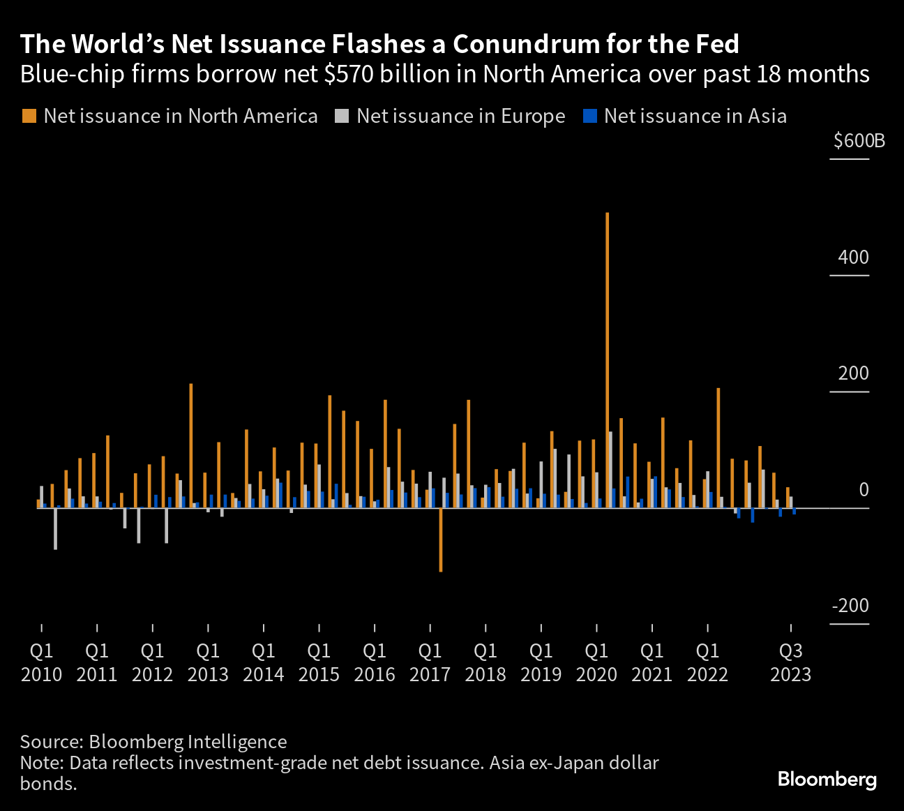The corporate borrowing binge during these past 18 months is, for the most part, a North American phenomenon. Investment-grade borrowers in Europe added a much smaller amount of net debt over that time — $150 billion — while in Asia, their net borrowing declined by about $70 billion, BI data show.
