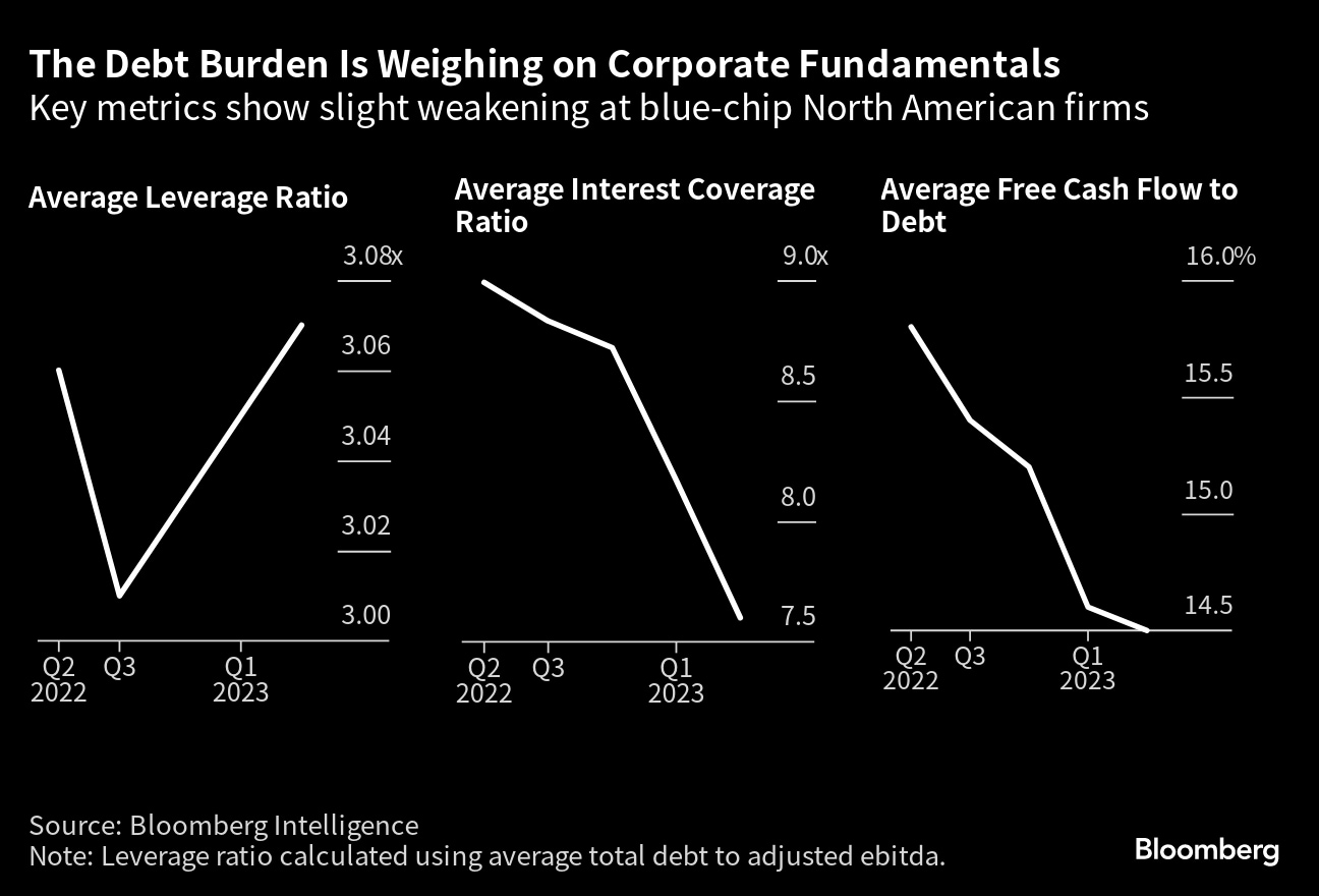 Indicators of the financial health of investment-grade companies have begun to deteriorate, according to BI data. As their leverage ticked up between the end of March 2022 and mid-2023, a key gauge of their ability to make payments — known as interest coverage — edged lower, the data show.
