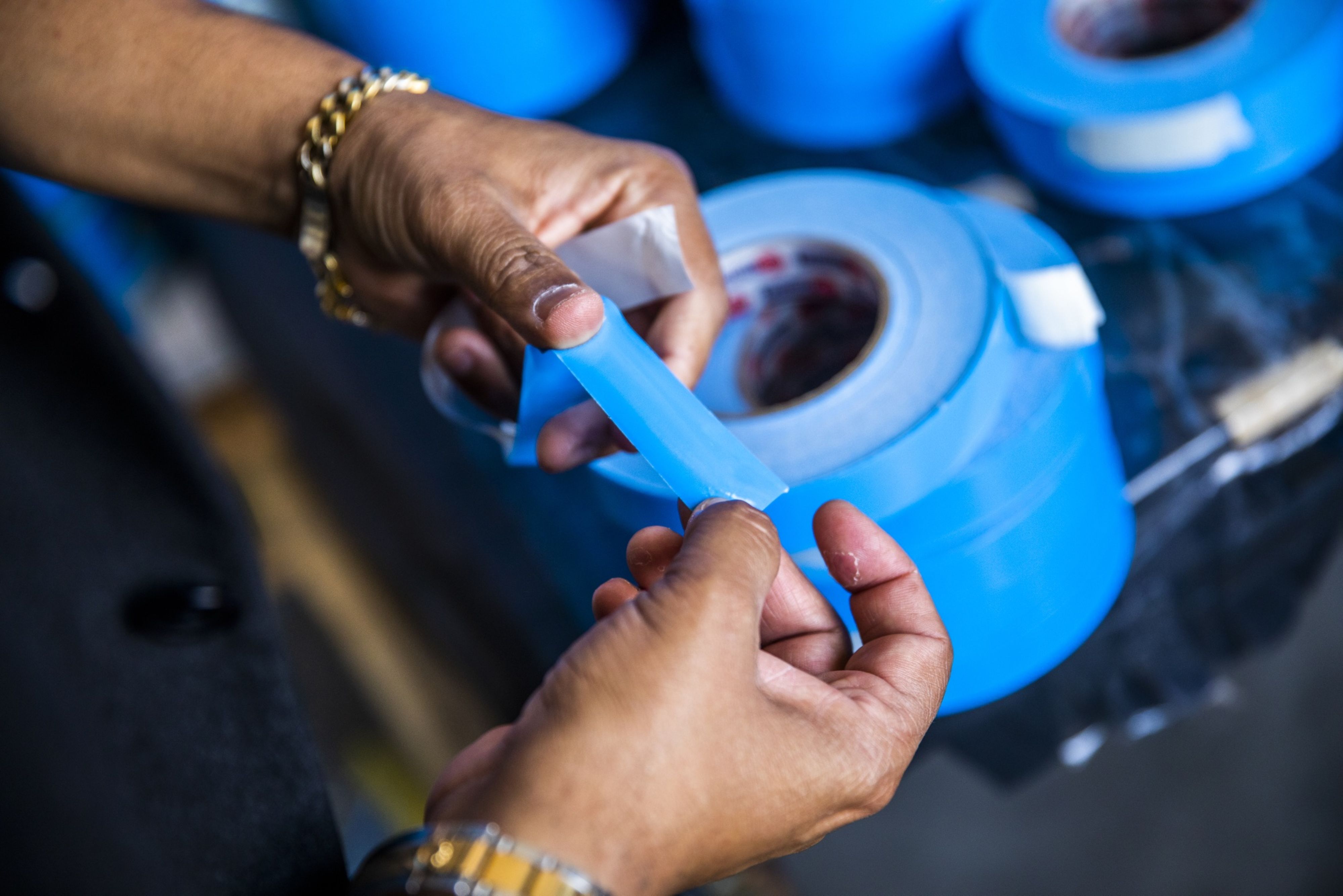 A man checks a roll of adhesive sealing tape at the company’s factory in Haryana, India. (Photographer: Prashanth Vishwanathan/Bloomberg)