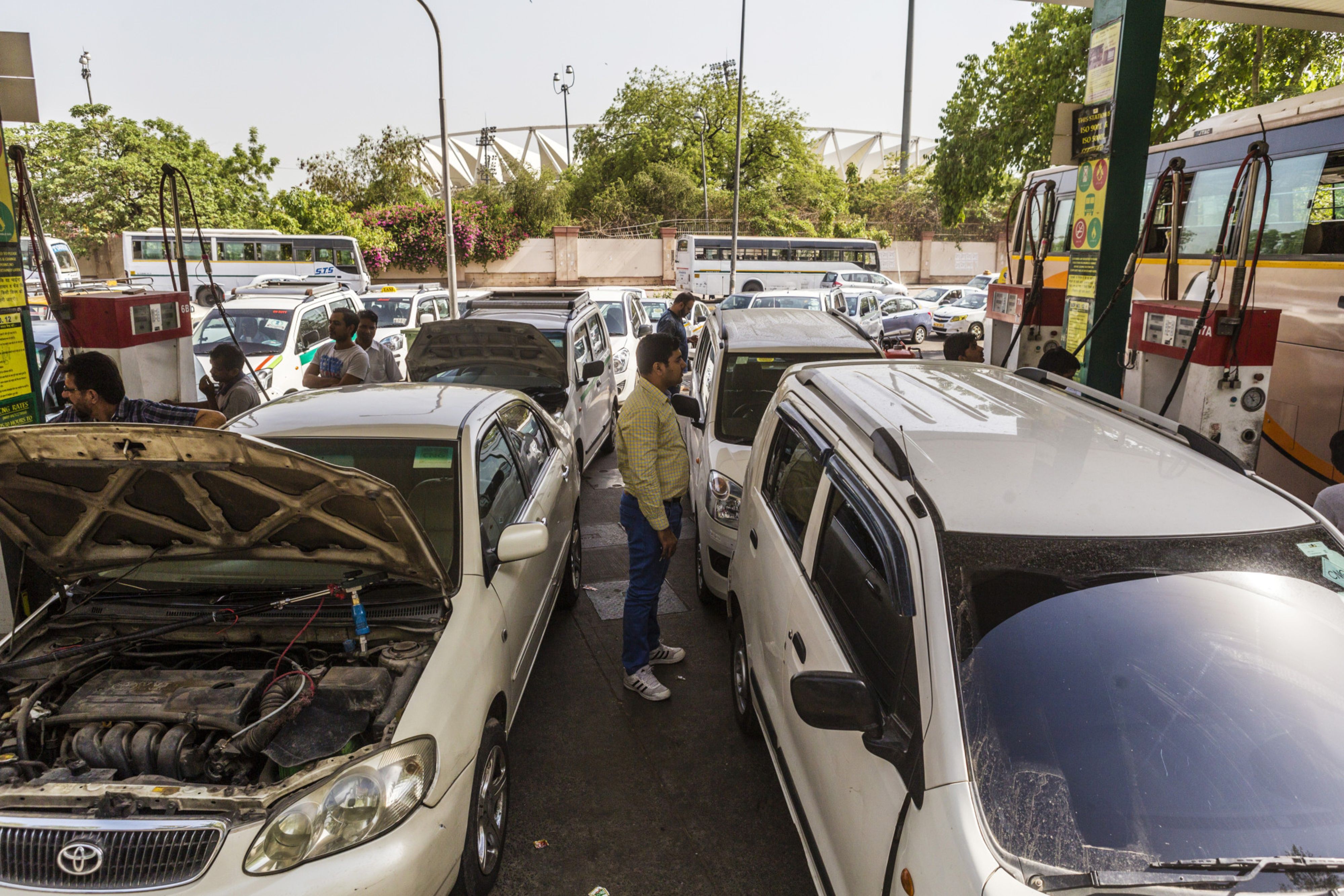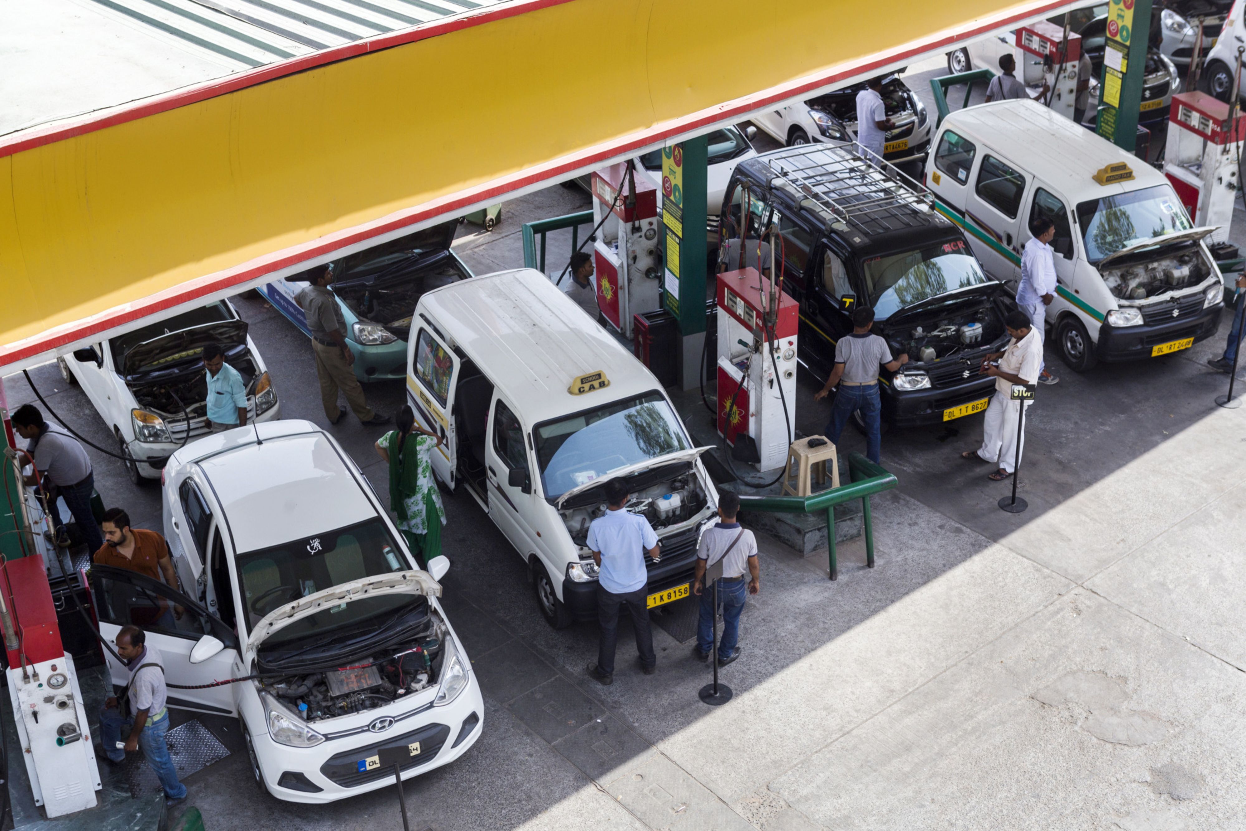 Vehicles wait in line to be refueled with compressed natural gas (CNG) at an Indraprastha Gas Ltd. gas station in New Delhi, India. (Photographer: Prashanth Vishwanathan/Bloomberg)