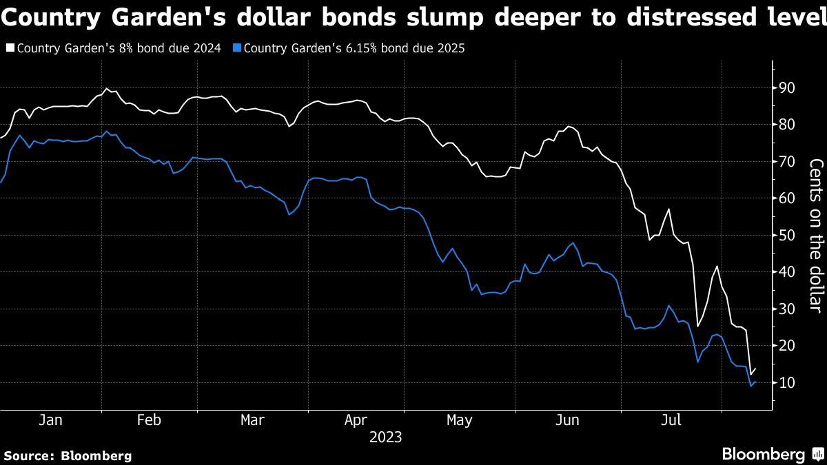 The developer's next dollar bond to mature has dropped as low as 11 cents, in a sign of how dire investors see the situation. Country Garden's shares fell as much as 8.9% in Hong Kong on Wednesday to reach the lowest level since November 2022, and three brokers have downgraded the stock.