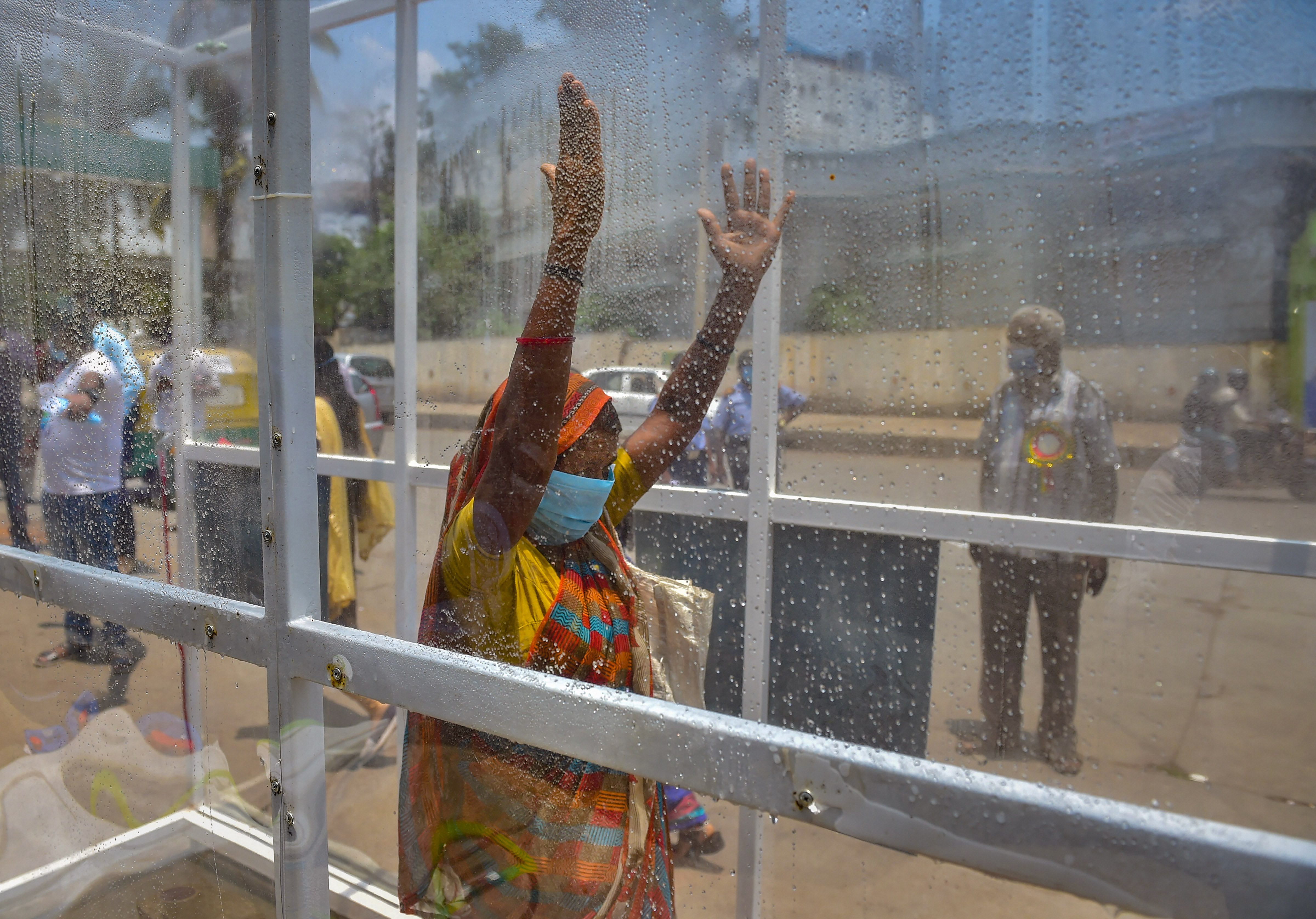 A woman passes through a disinfectant tunnel at the entrance of an APMC market in Bengaluru, during the nationwide lockdown to curb the spread of coronavirus, on April 9, 2020. (Photographer: Shailendra Bhojak/PTI)