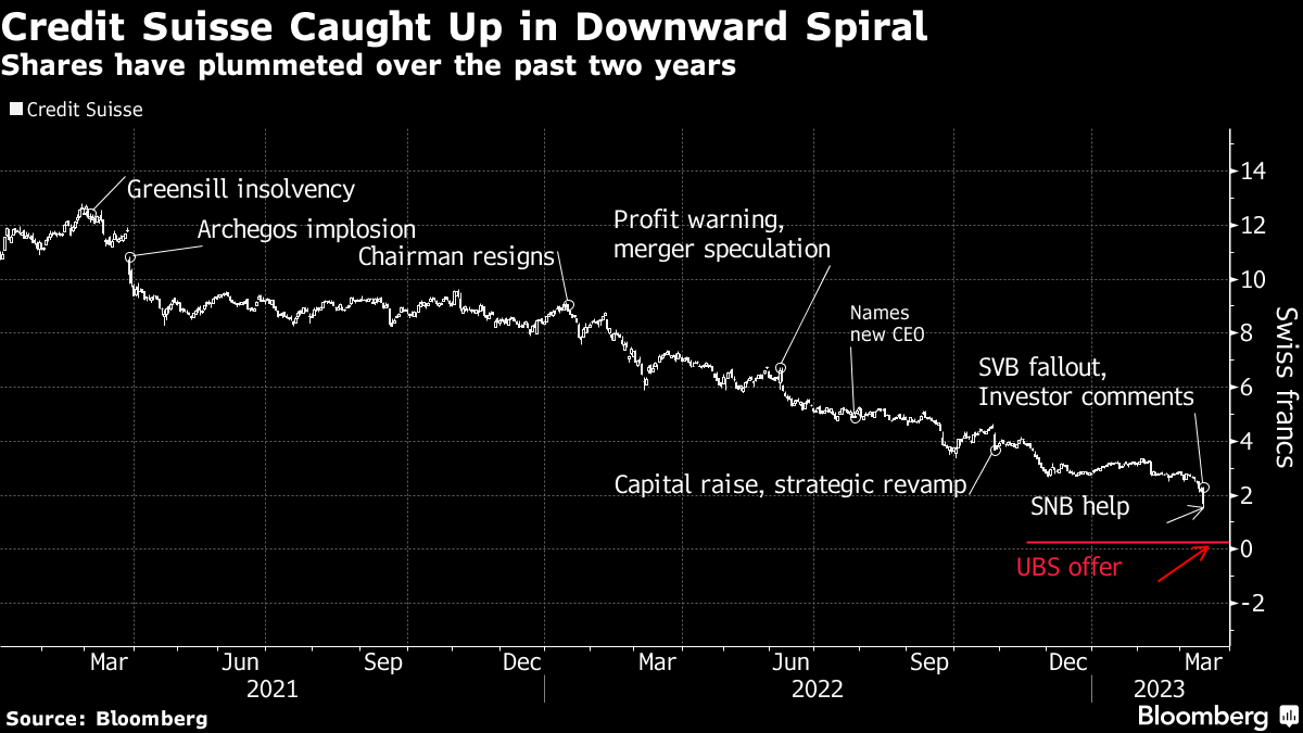 Swiss authorities are seeking to broker a deal that would address a rout in Credit Suisse that sent shock waves across the global financial system over the past week when panicked investors dumped its shares and bonds following the collapse of several smaller US lenders. Years of struggles came to a head after the firm said its efforts to win back clients hadn't halted outflows this year and the Saudi National Bank ruled out taking a larger stake.