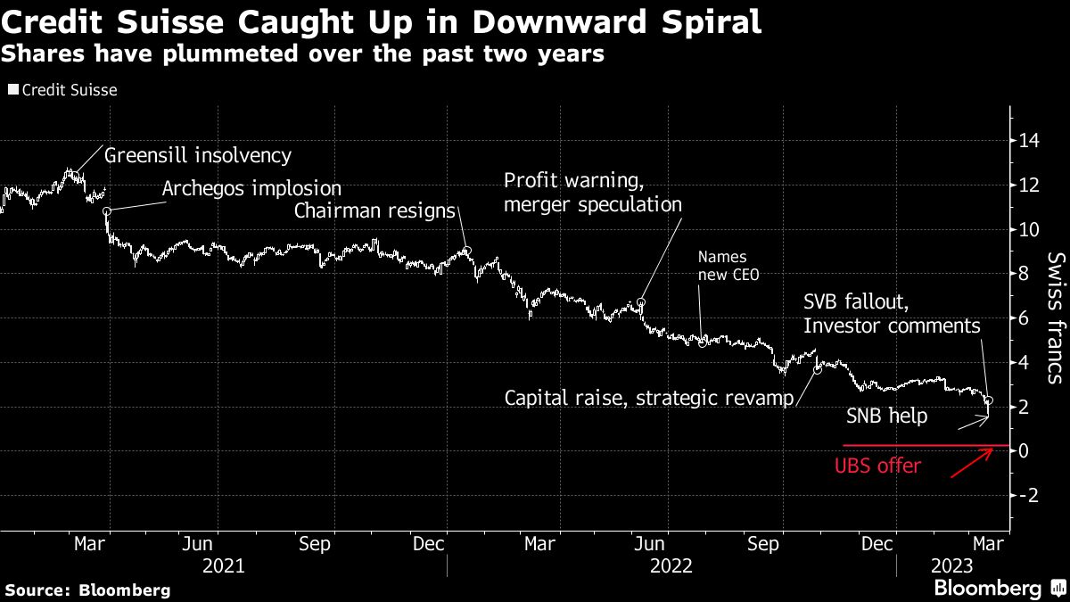 Swiss authorities are seeking to broker a deal that would address a rout in Credit Suisse that sent shock waves across the global financial system over the past week when panicked investors dumped its shares and bonds following the collapse of several smaller US lenders. Years of struggles came to a head after the firm said its efforts to win back clients hadn't halted outflows this year and the Saudi National Bank ruled out taking a larger stake.