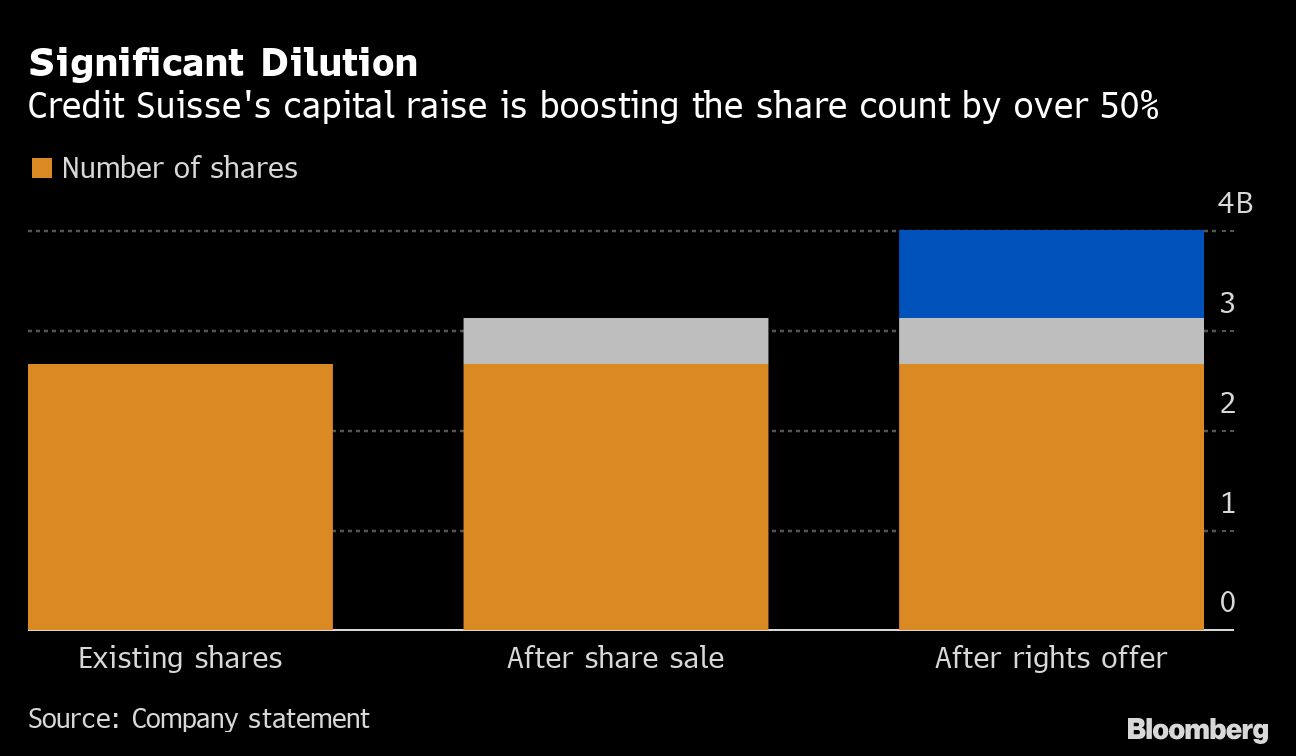 A rights issue is an offering of shares to existing investors to allow them to buy shares in proportion to their holding at a discounted price. Taking up the rights compensates investors for the dilution that occurs in a capital raising. In total, Credit Suisse is planning to issue 1.35 billion new shares, an increase of more than half compared with the 2.65 billion common shares it had outstanding at the end of September.