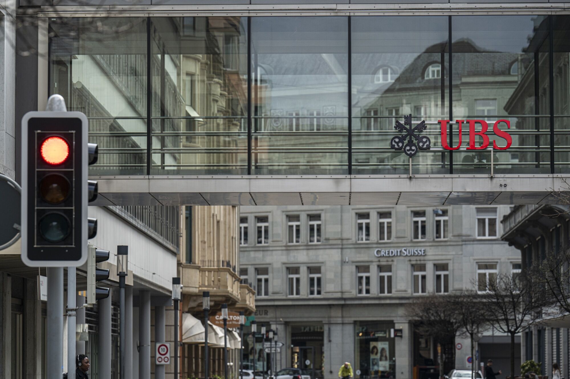 The Credit Suisse Group AG and UBS Group AG logos in Zurich, Switzerland, on Sunday, March 19, 2023. UBS Group AG and Swiss officials are racing to put together a deal for the firm to take over battered rival Credit Suisse Group AG this weekend as they seek to navigate thorny issues such as a government backstop and the fate of the smaller firm’s investment bank. Photographer: Pascal Mora/Bloomberg