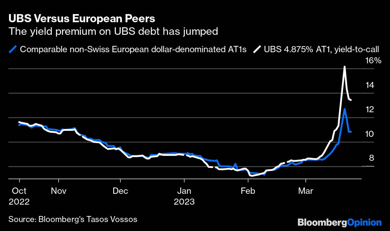 The biggest headache for UBS is what it does with its own $12 billion of AT1 debt, which is trading at yields north of 15% compared with less than 12% for the broader Bloomberg European CoCos index. After swallowing Credit Suisse, it will ironically have a lack of the riskiest type of AT1 bail-in capital. It plans to shrink the combined balance sheet, but bank analysts estimate UBS could need as much as $10 billion more AT1s — just when the legitimacy of that asset class has been brought into question broadly, and the Swiss version of it especially.