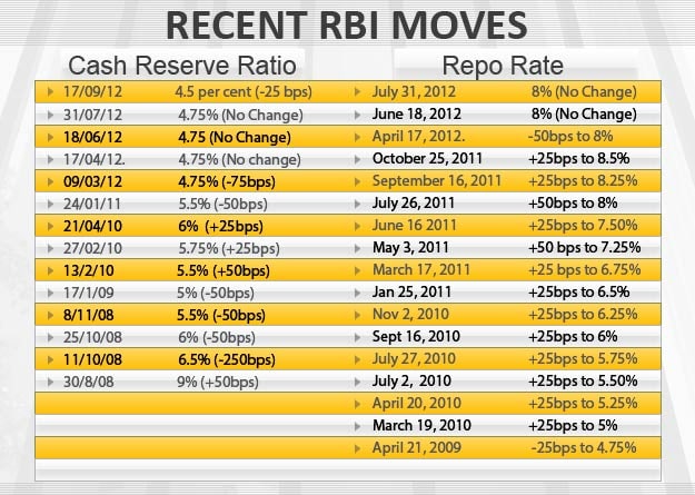 There are expectations that the CRR reduction sets the stage for a cut in key lending rates by the central bank at its next policy review on October 30, 2012.