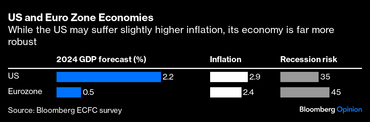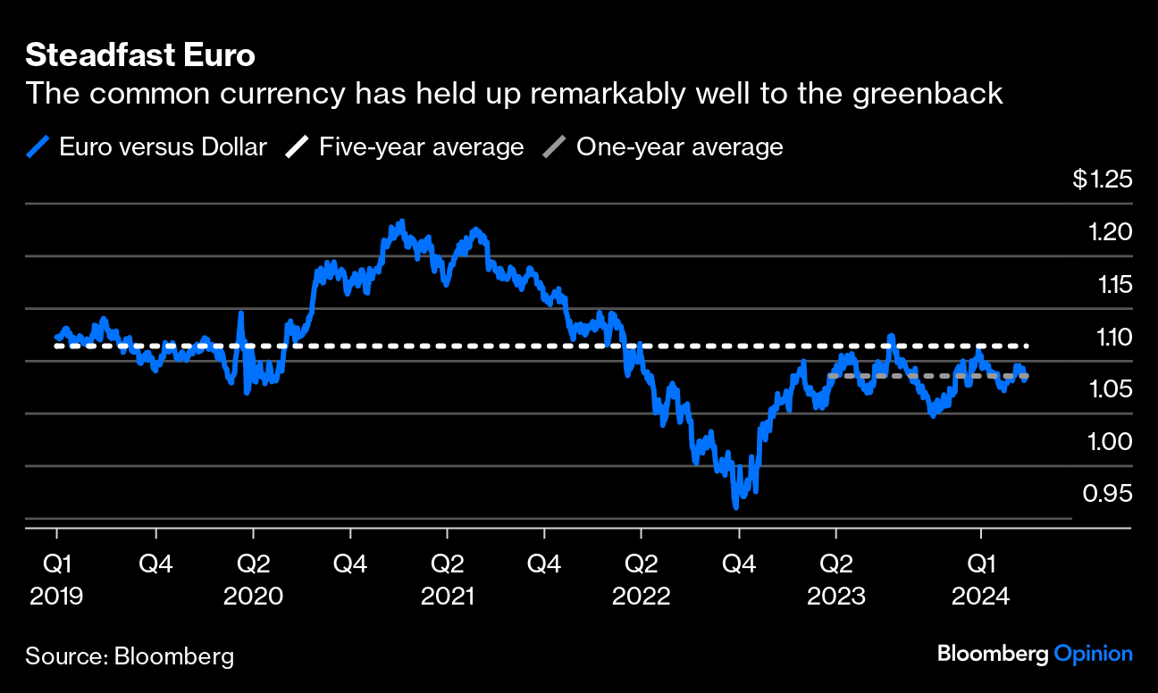 (Bloomberg Opinion) -- Despite the euro zone having lower official interest rates and a notably softer economy than the US, the euro has held up remarkably well against the dollar. The foreign exchange market's most popular currency pair trades not just in line its $1.085 average of the past year but within reach of the $1.11 five-year mean. The common currency, however, can't defy gravity forever — so a return toward parity with the greenback looks more likely than not over the course of this year.