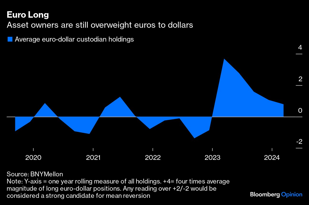 One other salient factor is investor positioning. Bank of New York Mellon Corp.'s proprietary iFlow system tracks its global custody client holdings which, worth $46 trillion, are the world's biggest. On balance, clients remain overweight in euros. Geoffrey Yu, the bank's senior strategist expects euro-dollar parity to return, not just due to fundamental economic and monetary reasons but because investors are shifting rapidly from being extremely long of euros.
