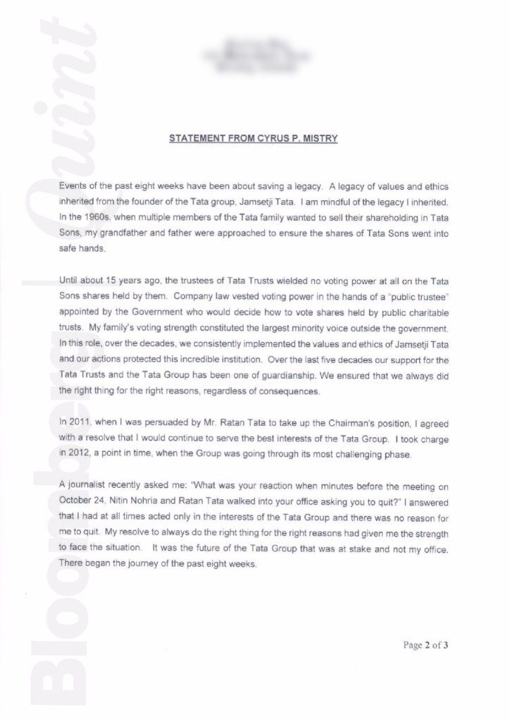 Towards this end, the objective of effective reform and the best interest of employees, public shareholders and other stakeholders of the Tata Group (the very people I sought to protect as Chairman) would be better served by moving away from the forum of the extraordinary general meetings.”Cyrus Mistry