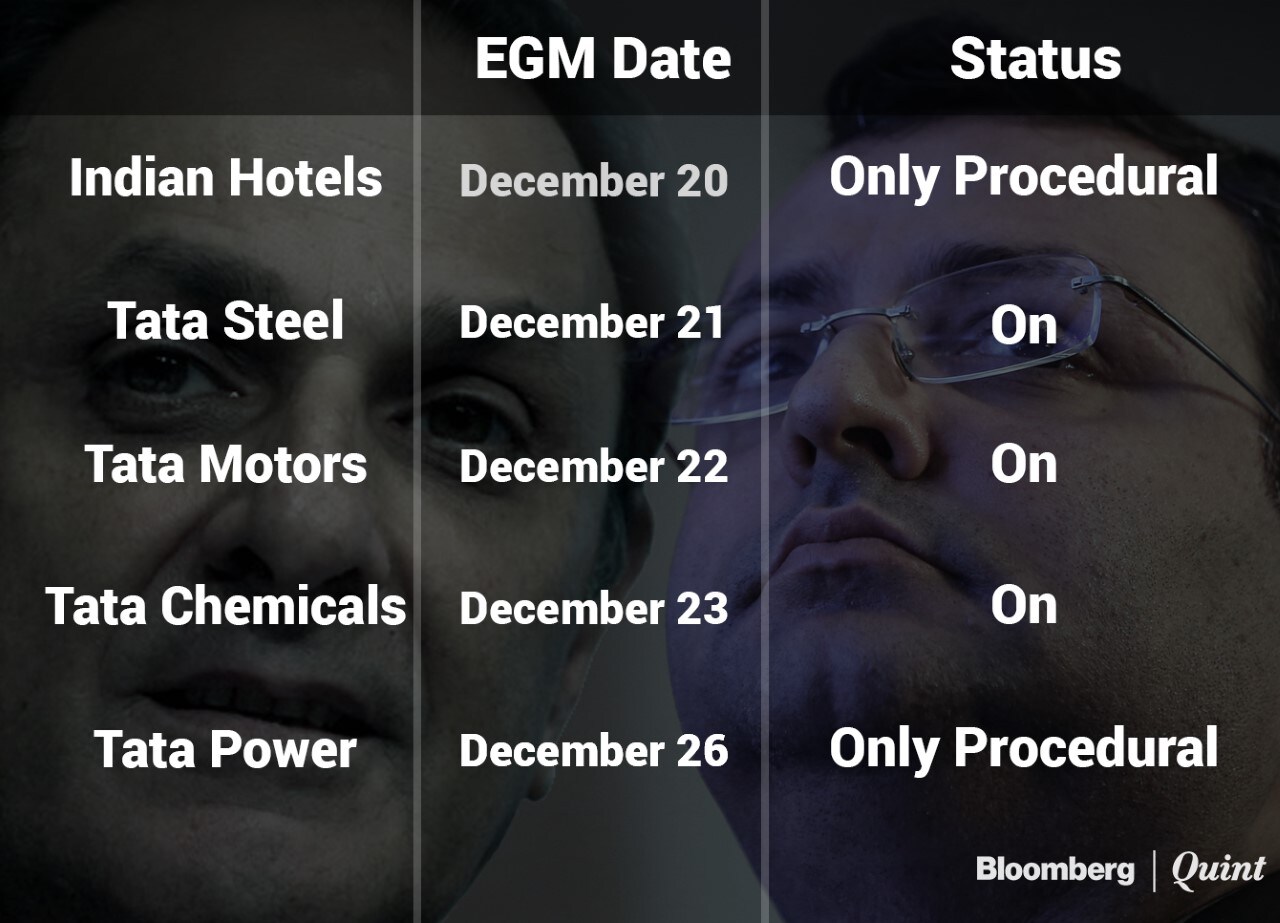 Consequently, the extraordinary general meetings (EGM) convened for his removal by Tata Power Ltd. and Indian Hotels Company Ltd. are now merely procedural. The other EGMs convened by Tata Steel Ltd., Tata Motors Ltd. and Tata Chemicals Ltd. will go on according to schedule as they also seek to remove Nusli Wadia as an independent director.