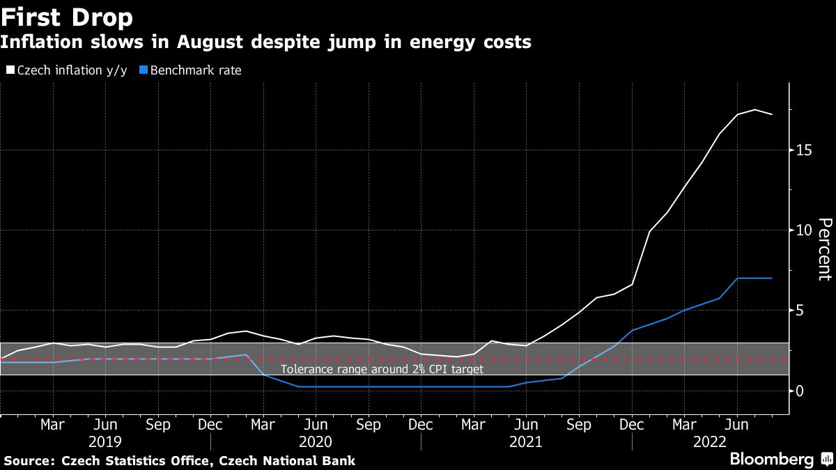Consumer prices rose 17.2% from a year earlier, driven by higher costs of electricity and natural gas, the Czech Statistics Office said on Monday. The reading was below the central bank's 19.3% projection for the month and also trailed the 17.7% median analyst estimate in a Bloomberg survey.