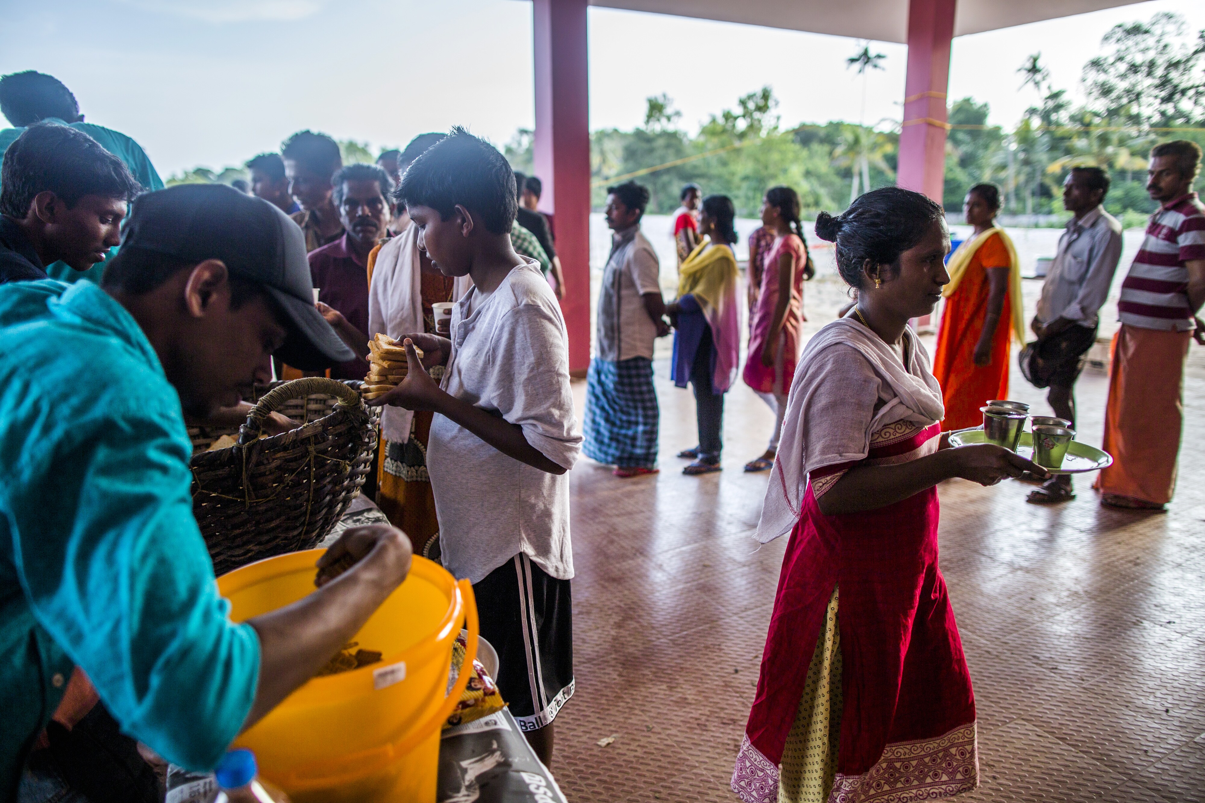 Flood victims wait in line to pick up tea and snacks at a relief camp. Photographer: Prashanth Vishwanathan/Bloomberg