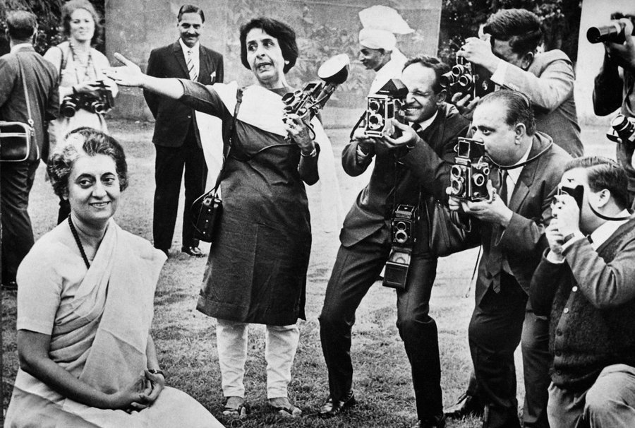 Homai Vyarawalla and other photojournalists, with Indira Gandhi. (Photograph: Indian National Congress)