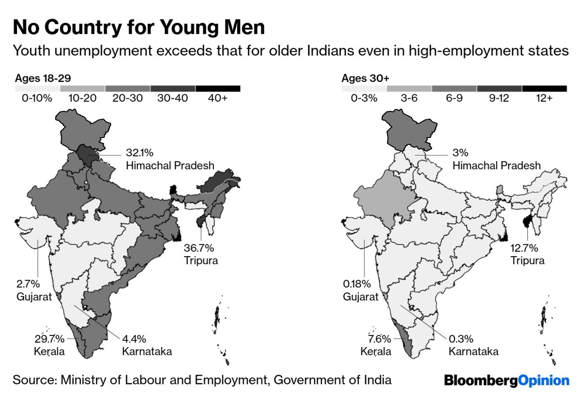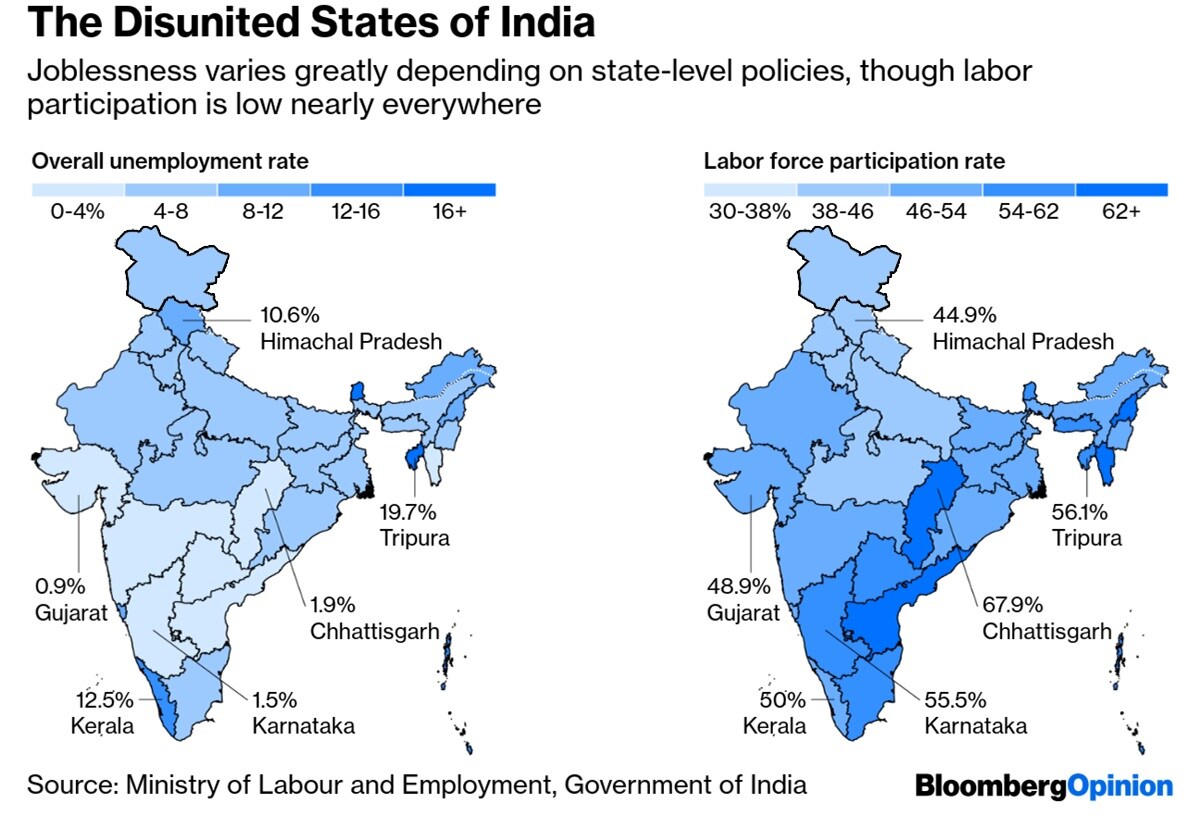Among those who are participating, the situation varies greatly depending on where they live. Dynamic states which are actively improving their ease of doing business -- including Chhattisgarh (1.9 percent), Karnataka (1.5 percent) and Gujarat (0.9 percent) -- recorded the lowest unemployment rates. By contrast, progressive states that have scored well on human-development indicators such as literacy and maternal health don't seem to be great job-creators: Unemployment in Kerala came in at 12.5 percent, while in Tripura and Himachal Pradesh it stood at 19.7 percent and 10.6 percent respectively. Not surprisingly, these states have lagged in improving their business environment.