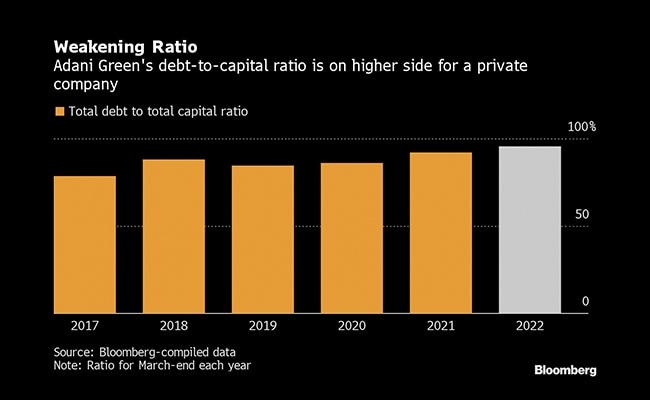 The Gautam Adani owned company's debt-to-capital ratio has soared to 95.3%, a level that is on the "higher side" for a private company, according to Sharon Chen, an analyst at Bloomberg Intelligence. The company's capital expenditure plans and its funding are other factors that need a close watch, Chen added.