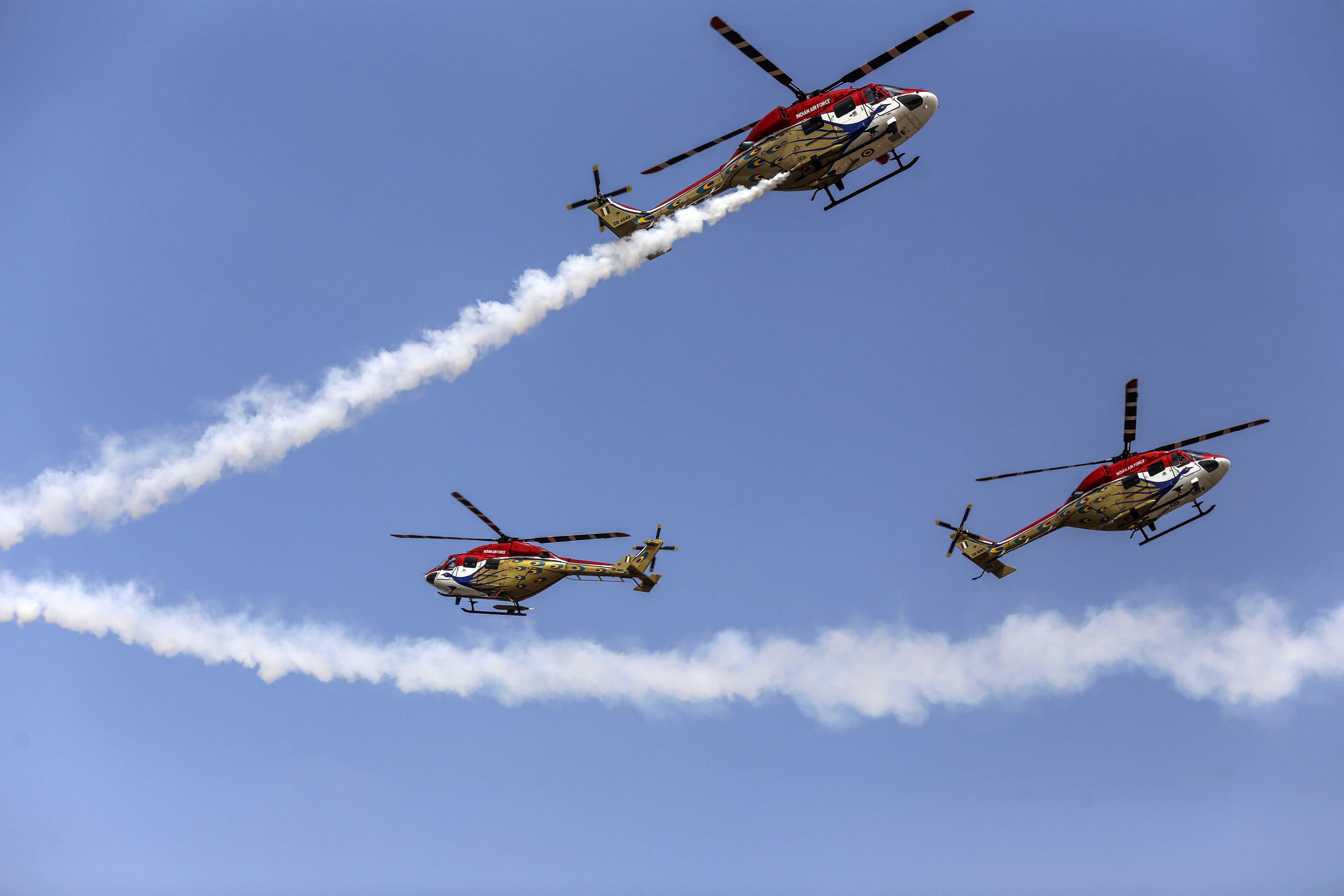 The Indian Air Force ‘Sarang’ display team at the Aero India 2017 air show. (Photographer: Dhiraj Singh/Bloomberg)