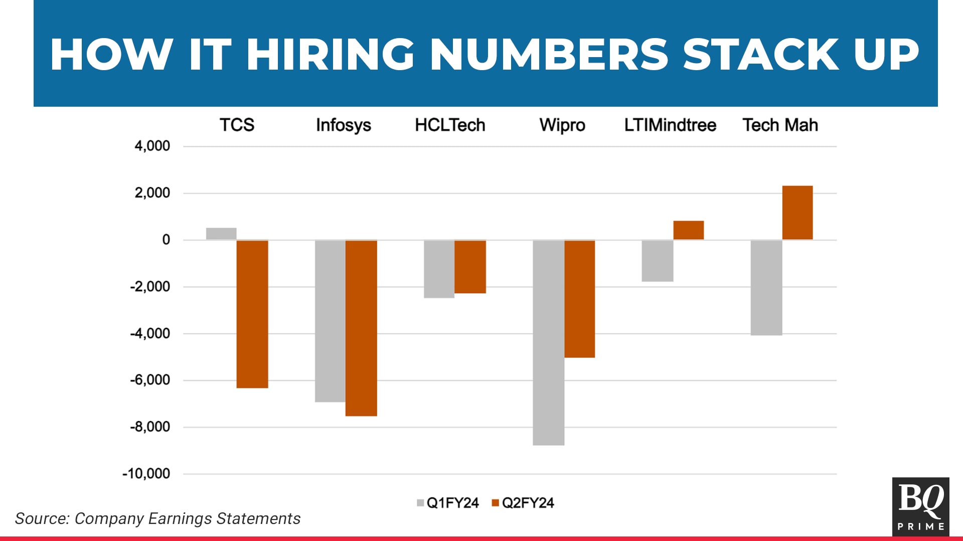 Headcount of India's top-tier outsourcers declined by a net 18,112 employees in the quarter ended September, according to earnings statements. Only LTIMindtree Ltd. (794) and Tech Mahindra Ltd. (2,307) clocked net additions. That translates to a nearly 40% decline for the full year, according to NLB Services. In absolute terms, the net hiring by top-tier IT firms has witnessed a drop of at least 2,50,000 in FY24.