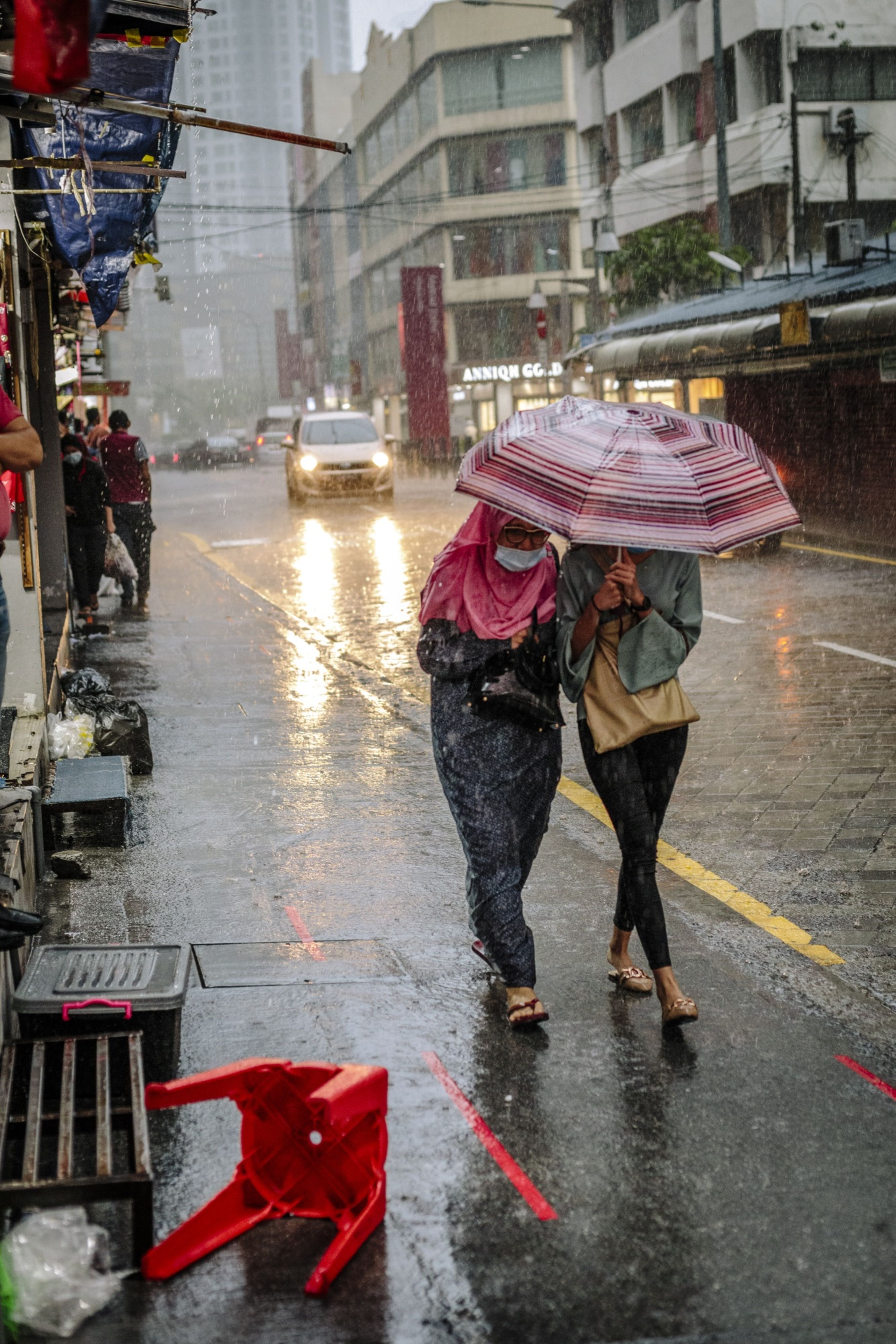 Pedestrians shelter under an umbrella as they walk through the rain. Photographer: Ian Teh/Bloomberg