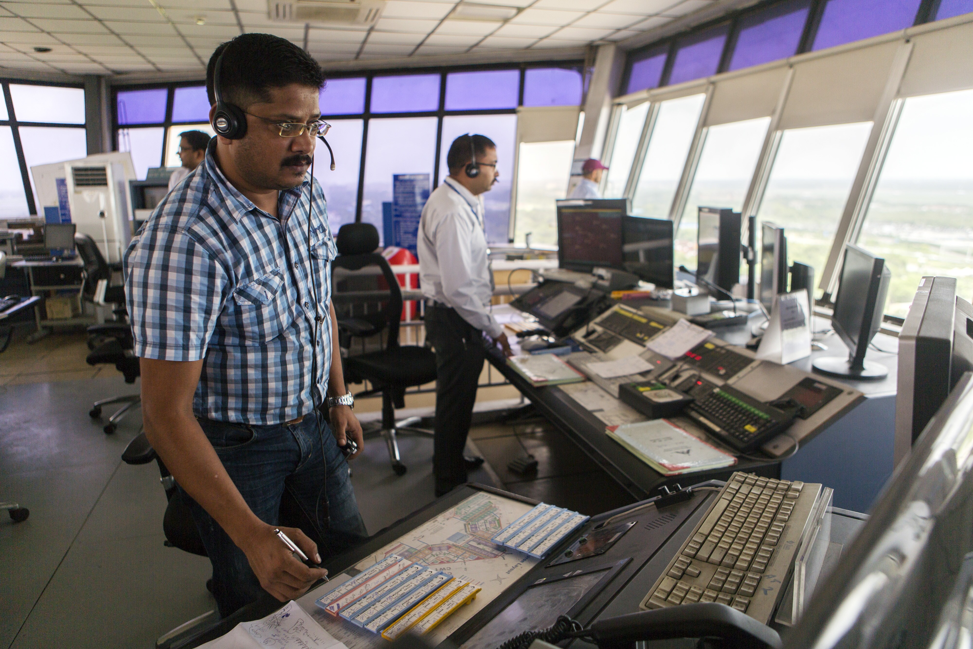 Air-traffic controllers work inside a control tower at an airport in India. (Photographer: Prashanth Vishwanathan/Bloomberg)