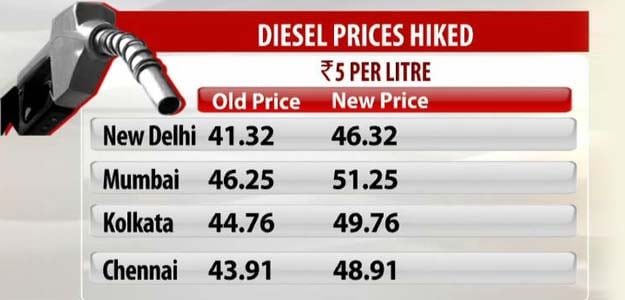 The price of diesel, which is partially deregulated product, had last been hiked by Rs 3 in July last year. The Rs 5 increase does not include value added tax. Diesel will now cost Rs 46.32 per litre in the Capital, and Rs 51.25 in Mumbai.