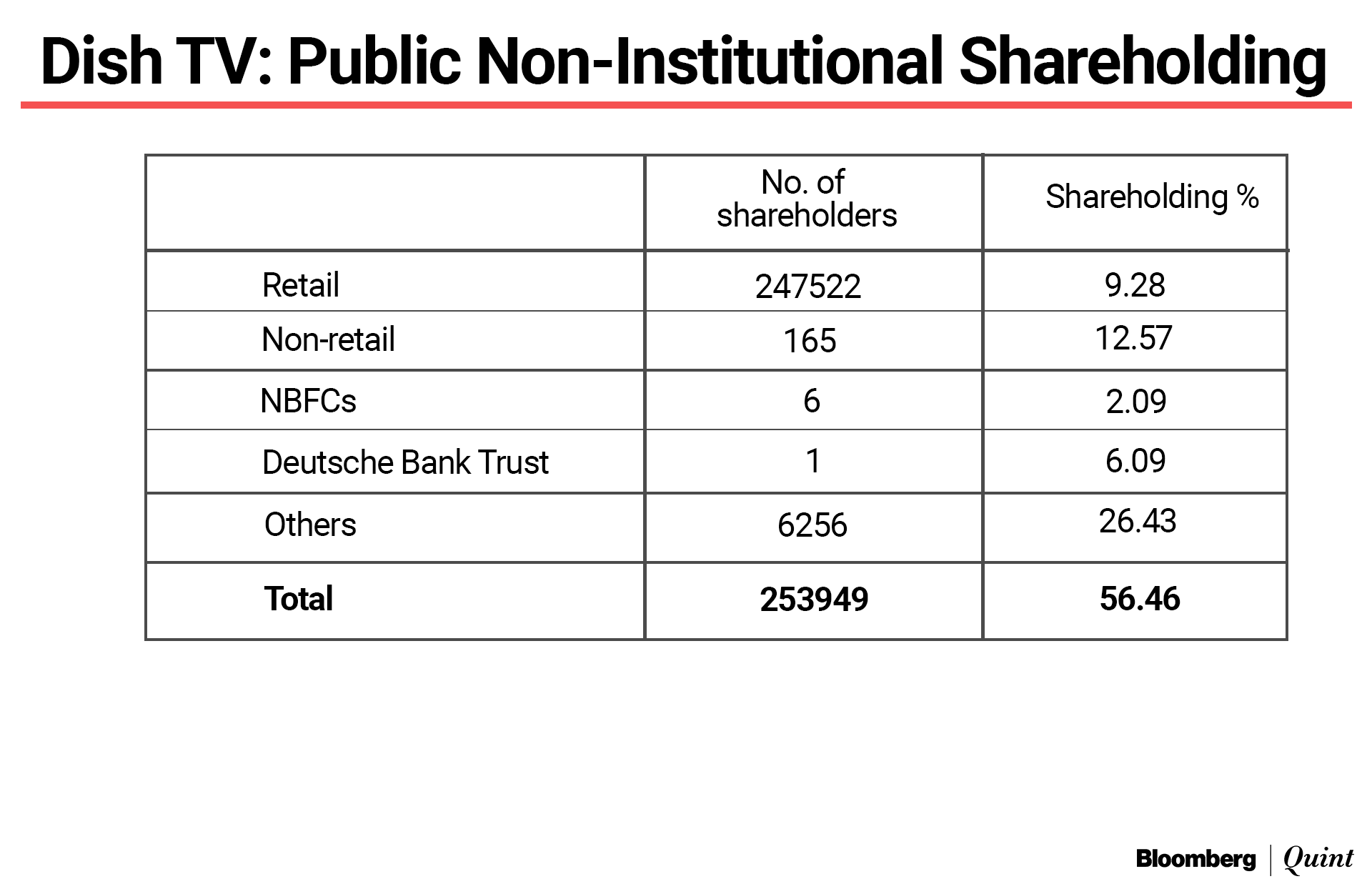 Founded by the Subhash Chandra family, and part of the Essel Group, Dish TV is now predominantly owned by public non-institutional shareholders, who hold 56.46%.