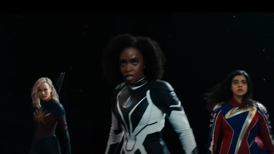 stars Brie Larson, reprising her role as Captain Marvel, who battles against the villain Dar-Benn, played by Zawe Ashton.