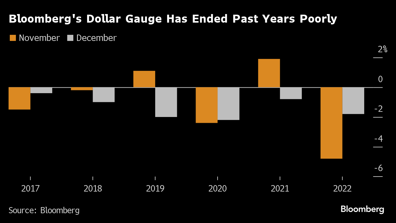 The Bloomberg Dollar Spot Index has slumped every December for the past six straight years, with an average drop of about 1.4%, with its weakness starting in November four times. A basket of Asian currencies against the dollar gained about 1.2% on average in both November and December.