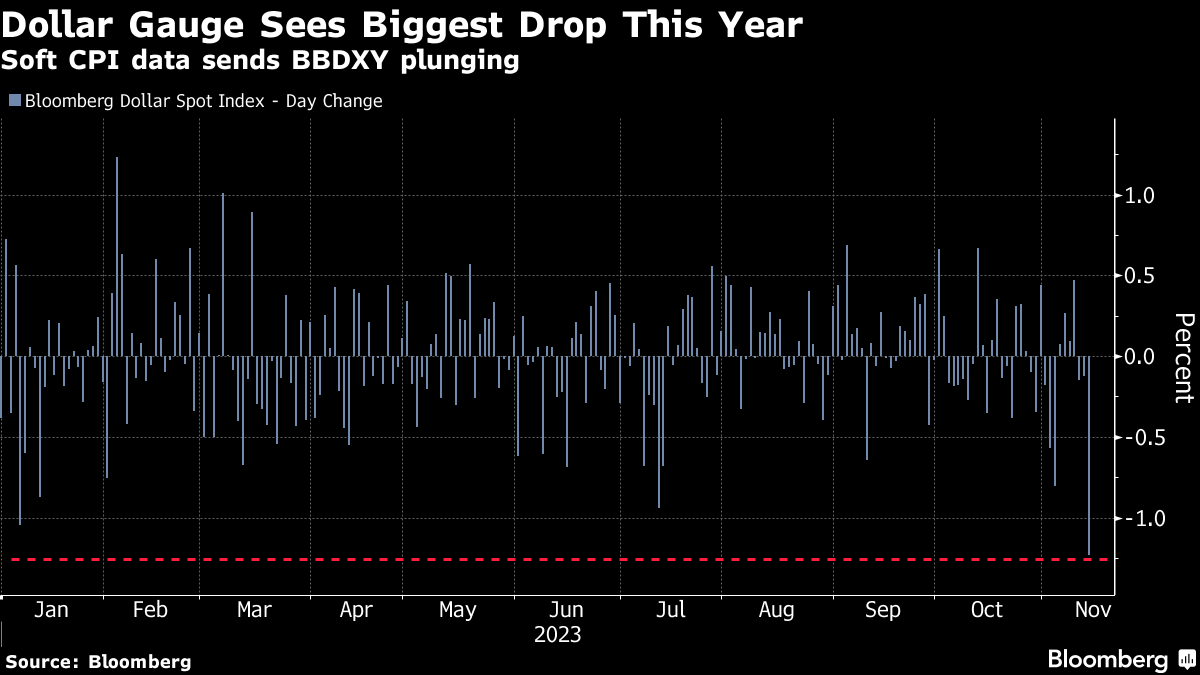 (Bloomberg) -- The US dollar tumbled by the most in a year after soft inflation data led traders to ramp up bets the Federal Reserve will start cutting interest rates by mid-2024, sending Treasury yields plunging.