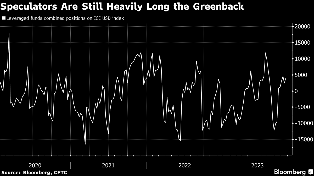 One-month risk reversals — a short-term measure of bullish sentiment and positioning — is approaching a three-month low, a sign that dollar buyers are not willing to chase a strengthening greenback at current levels. And JPMorgan Chase & Co.'s gauge of three-month implied currency volatility has fallen to the lowest since February 2022. That suggests investors are not expecting any dramatic dollar moves in coming months.