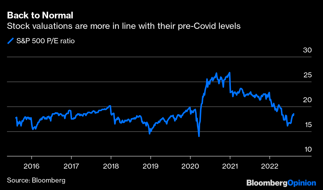 The reasons for the rebound are clear. Gasoline prices have fallen every day since peaking at $5.016 a gallon on June 13, dropping all the way to $3.99 amid a broad decline in commodities prices and alleviating substantial pressure on consumers. Companies have reported solid second-quarter earnings. The labor market remains unusually tight, with 528,000 jobs added in July, more than double the median estimate in a Bloomberg survey. There's even optimism that perhaps inflation has peaked and will start to slow after the government said this week that its consumer price index was unchanged in July from the month earlier.