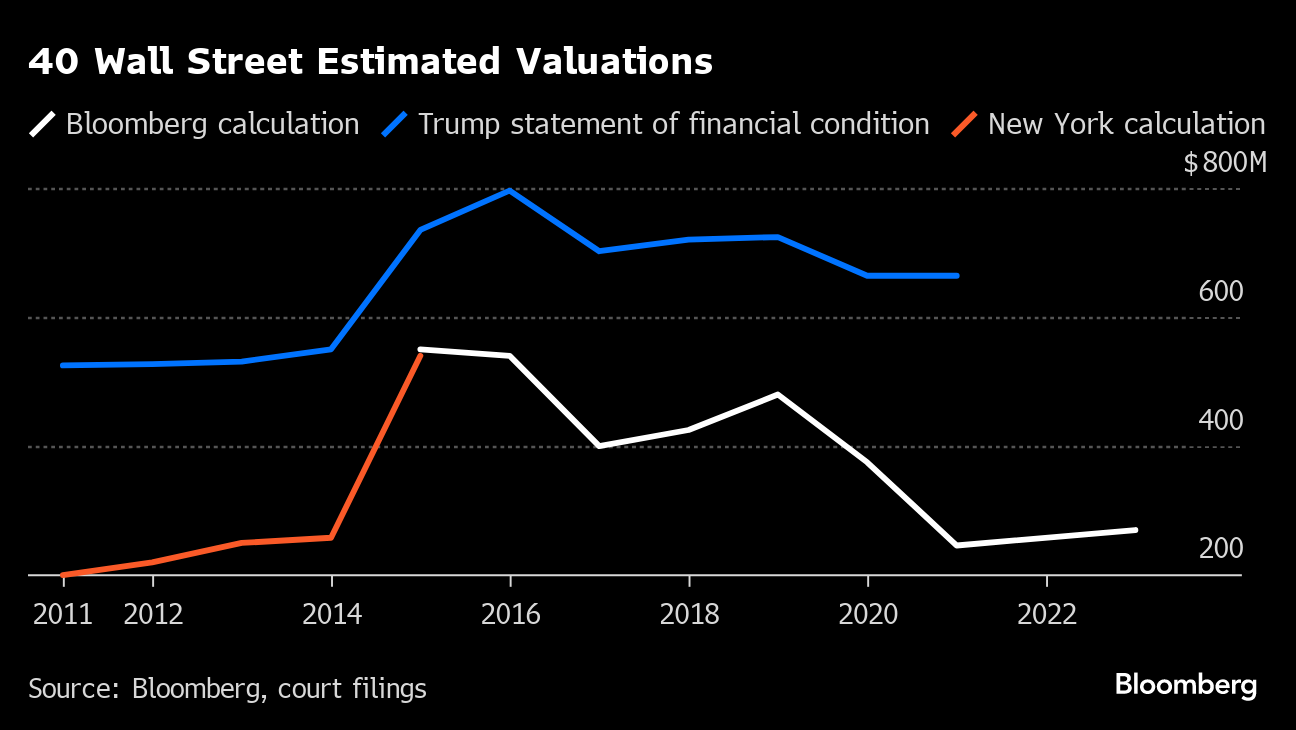 For example, 40 Wall Street was appraised by a real estate company at $200 million in 2011 and $220 million in 2012. Despite this, Trump valued the property in financial statements at $524.7 million and $527.2 million, respectively, for those years.