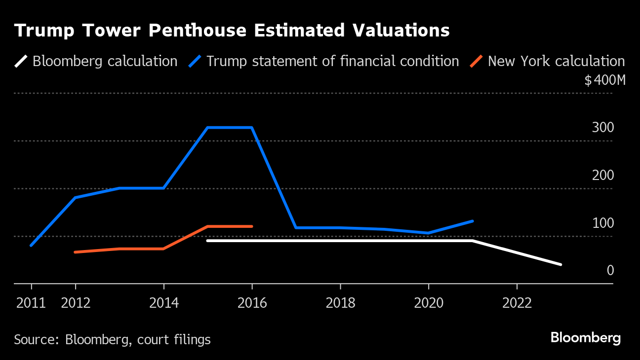 Bloomberg values the property using recent Trump Tower sales, as well as those of comparable Manhattan penthouses. While some splashy residences in much newer buildings on so-called Billionaires Row have listed for well in excess of $100 million, they typically boast higher ceilings, more up-to-date finishes, contemporary layouts, outdoor space and better views.