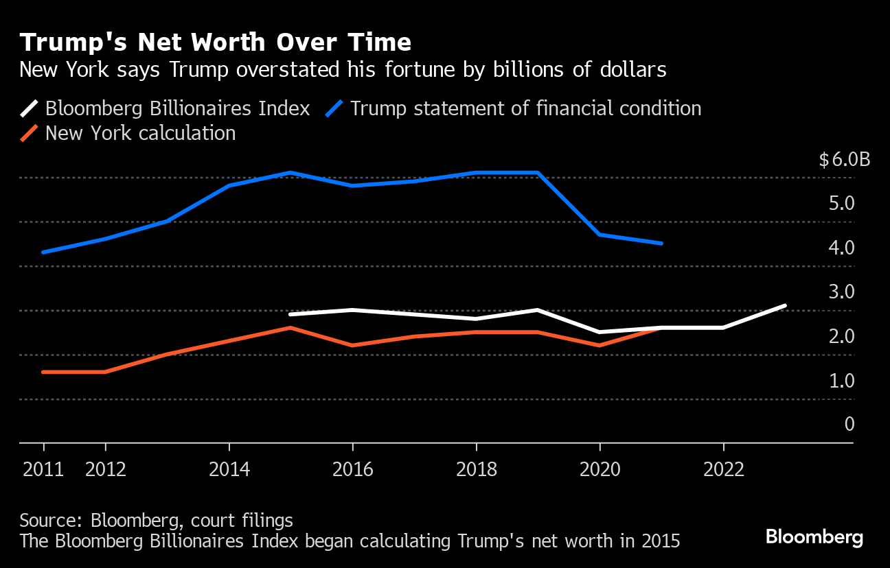 Bloomberg's wealth index has been calculating Trump's net worth since 2015, based on ethics disclosures required for presidential candidates, public filings tied to key real estate holdings and staff reporting. Thousands of pages of exhibits detailing the performance of his assets made available during the trial have provided a deeper look into his fortune.
