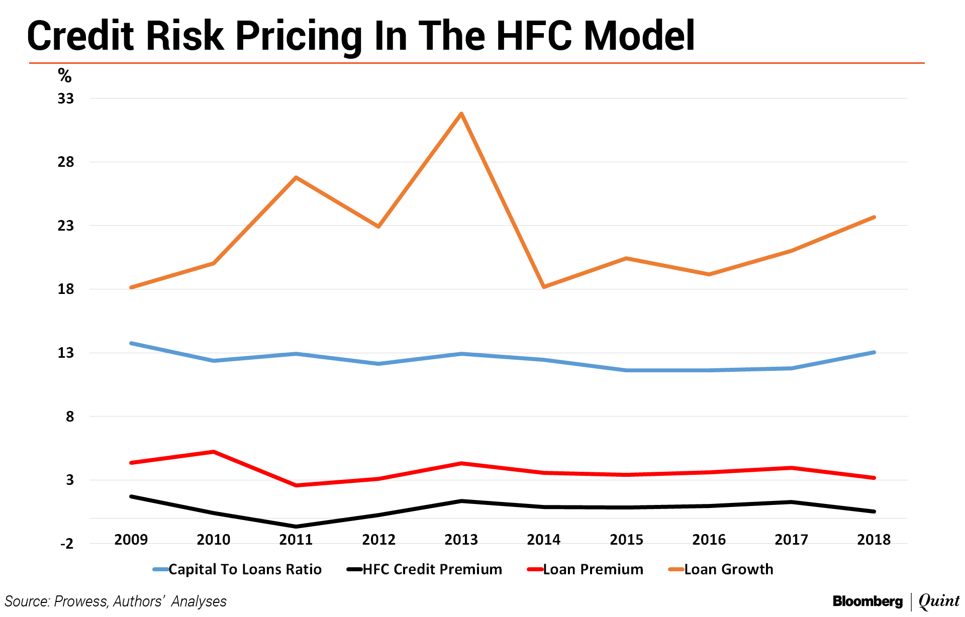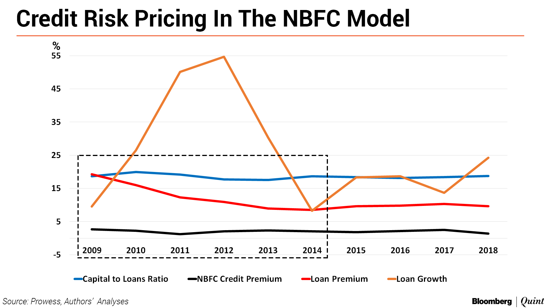 The alternate explanation for reducing loan premium is that NBFCs started systematically underpricing credit risk at a time of rapid growth. There was also no commensurate improvement in the capital levels to support this underpricing.