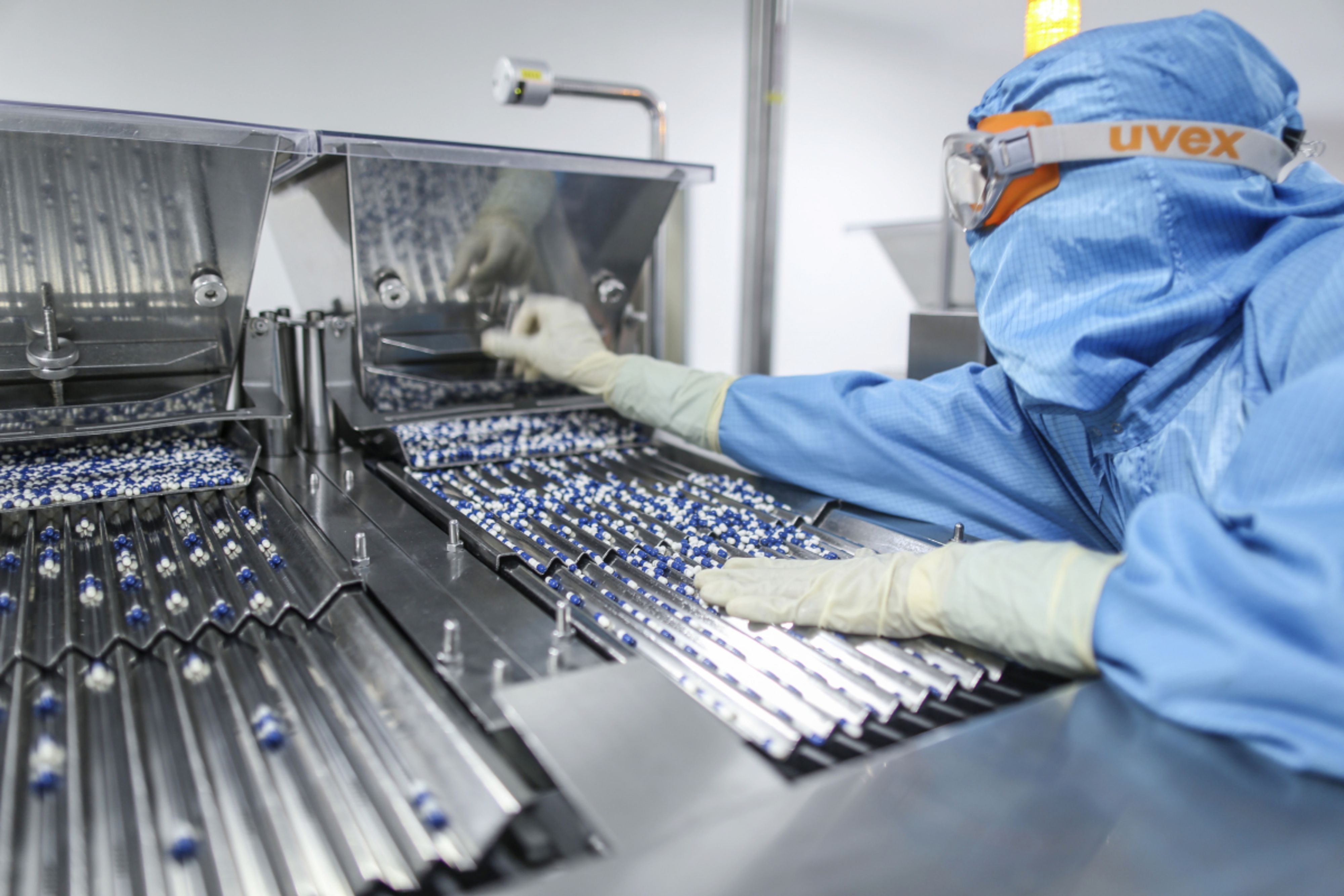 An employee operates machinery to arrange capsules for packaging at a pharmaceutical plant in Goa, India. (Photographer: Dhiraj Singh/Bloomberg)