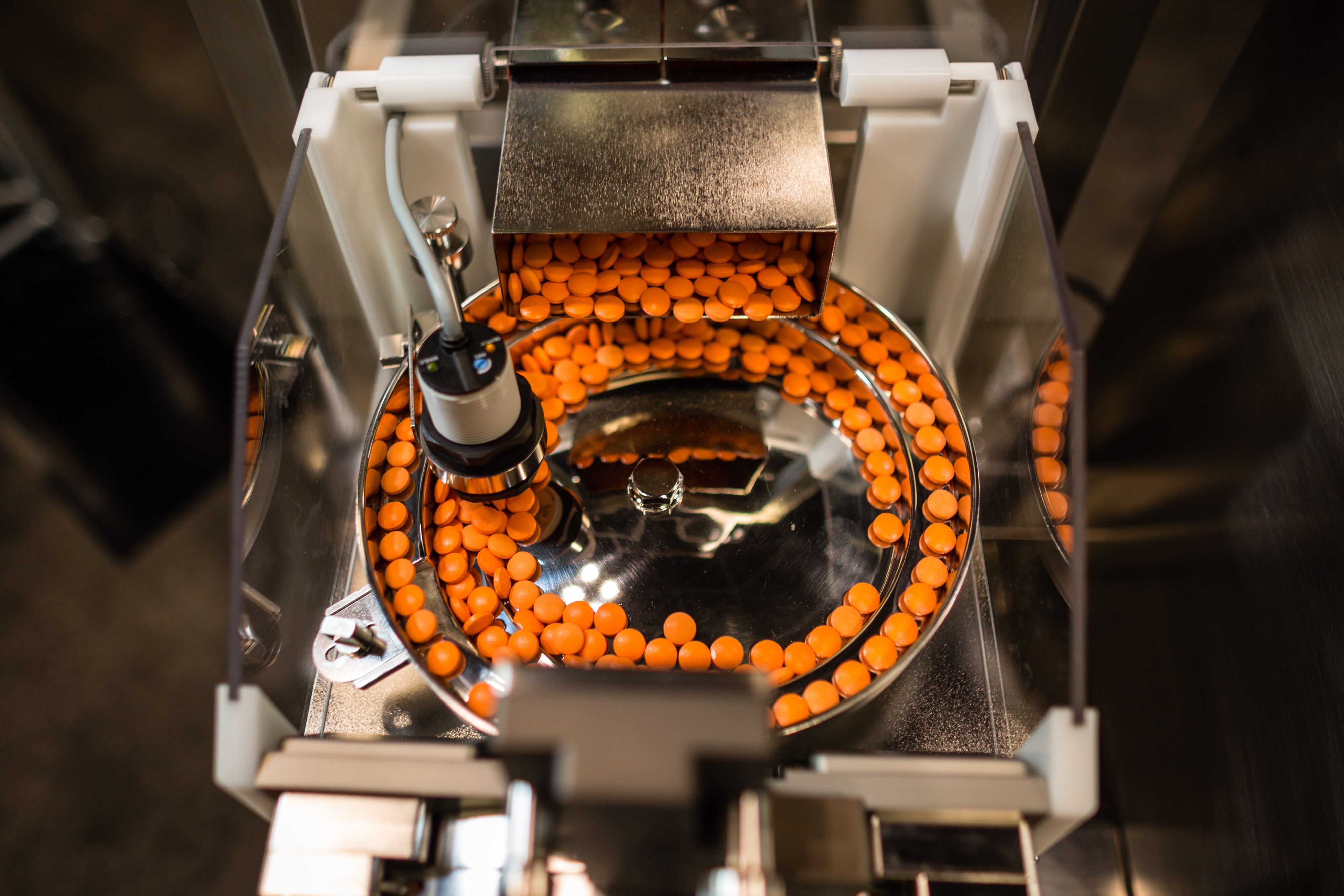 A pill compacting machine sits on display in New York, U.S. (Photographer: Timothy Fadek/Bloomberg)