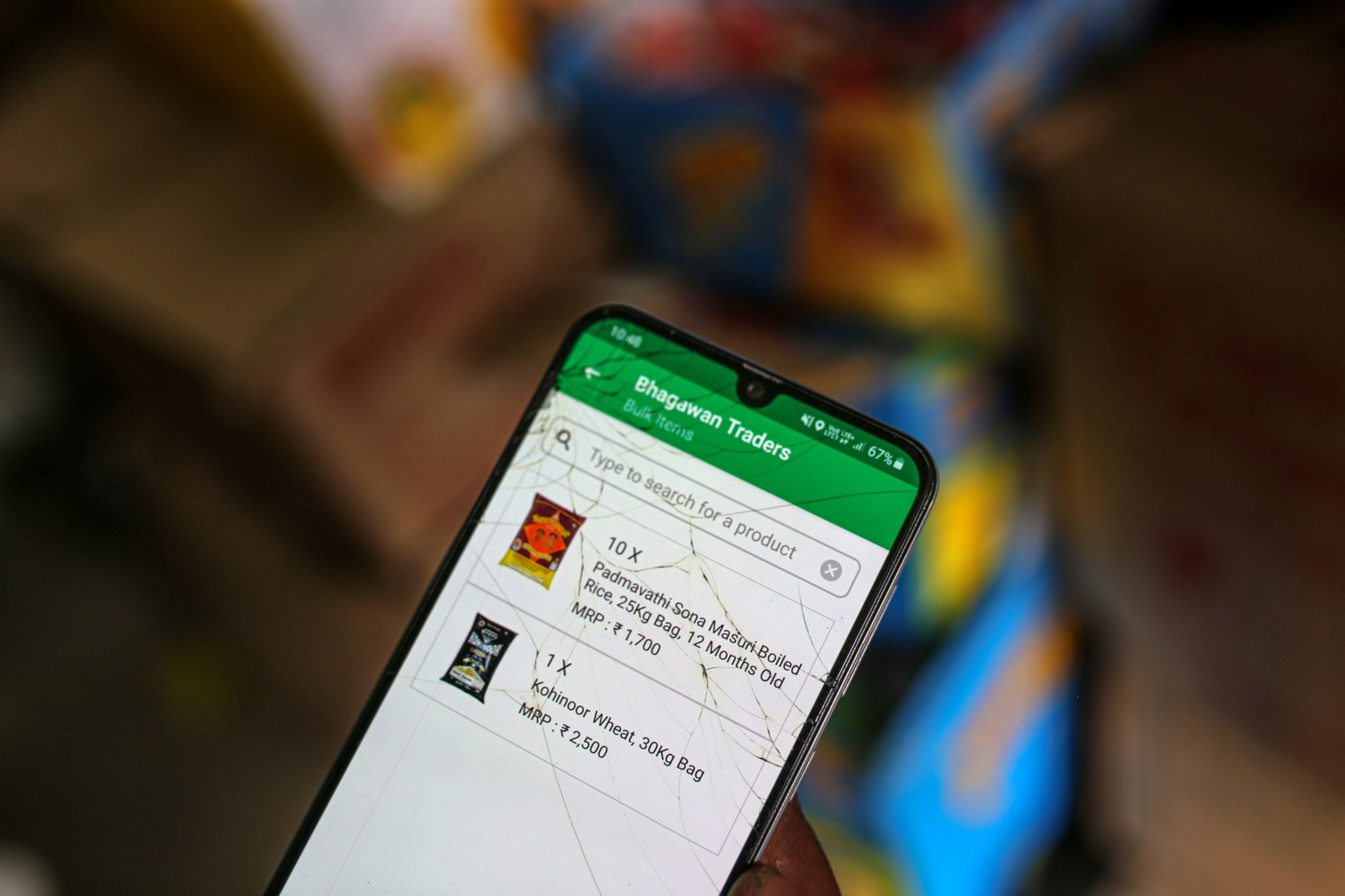 The app of Jumbotail, a platform that connects retailers with brands and producers, at a kirana store, in Bengaluru, on Jun. 21, 2021. (Photographer: Dhiraj Singh/Bloomberg)