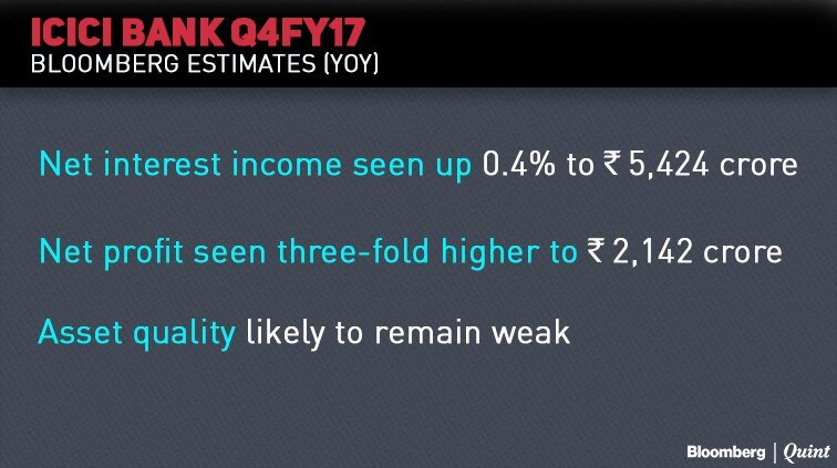 ICICI Bank's bottomline is expected to jump three-fold due to a low base in the same quarter last year, according to the consensus of analyst estimates tracked by Bloomberg. The lender had seen a 19 percent decline in net profit last quarter. Asset quality woes are likely to continue and movement of stressed assets will be closely watched.