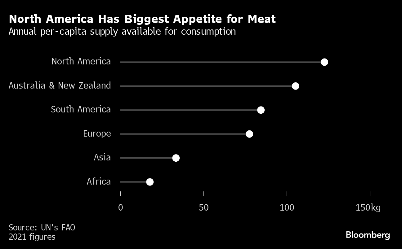 The average American consumes about 127 kilograms of meat a year compared with 7 kilograms in Nigeria and just 3 kilograms in the Democratic Republic of Congo, according to the FAO data. The Eat-Lancet Commission recommends people consume no more than 15.7 kilograms of meat a year.
