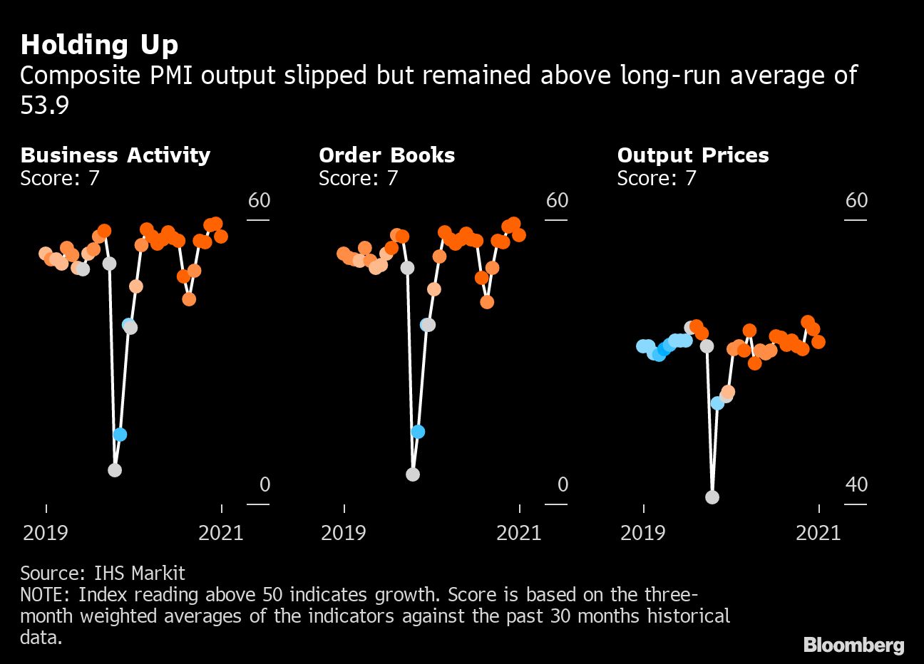 Activity in India's dominant services sector expanded for the fifth month, and manufacturing for the sixth, although growth in new work and production lost some momentum, according to IHS Markit. While the composite index slipped to 56.4 last month from 59.2 in November, it held up above its long-run average.