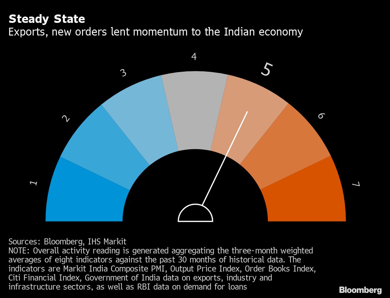 That's the reading from the overall activity tracker comprising eight high-frequency indicators compiled by Bloomberg News. While the needle on a dial measuring the so-called ‘Animal Spirits' stayed unchanged at 5 for a seventh month, top producers across consumer durables and automobiles signaled weakness as the year wound down.