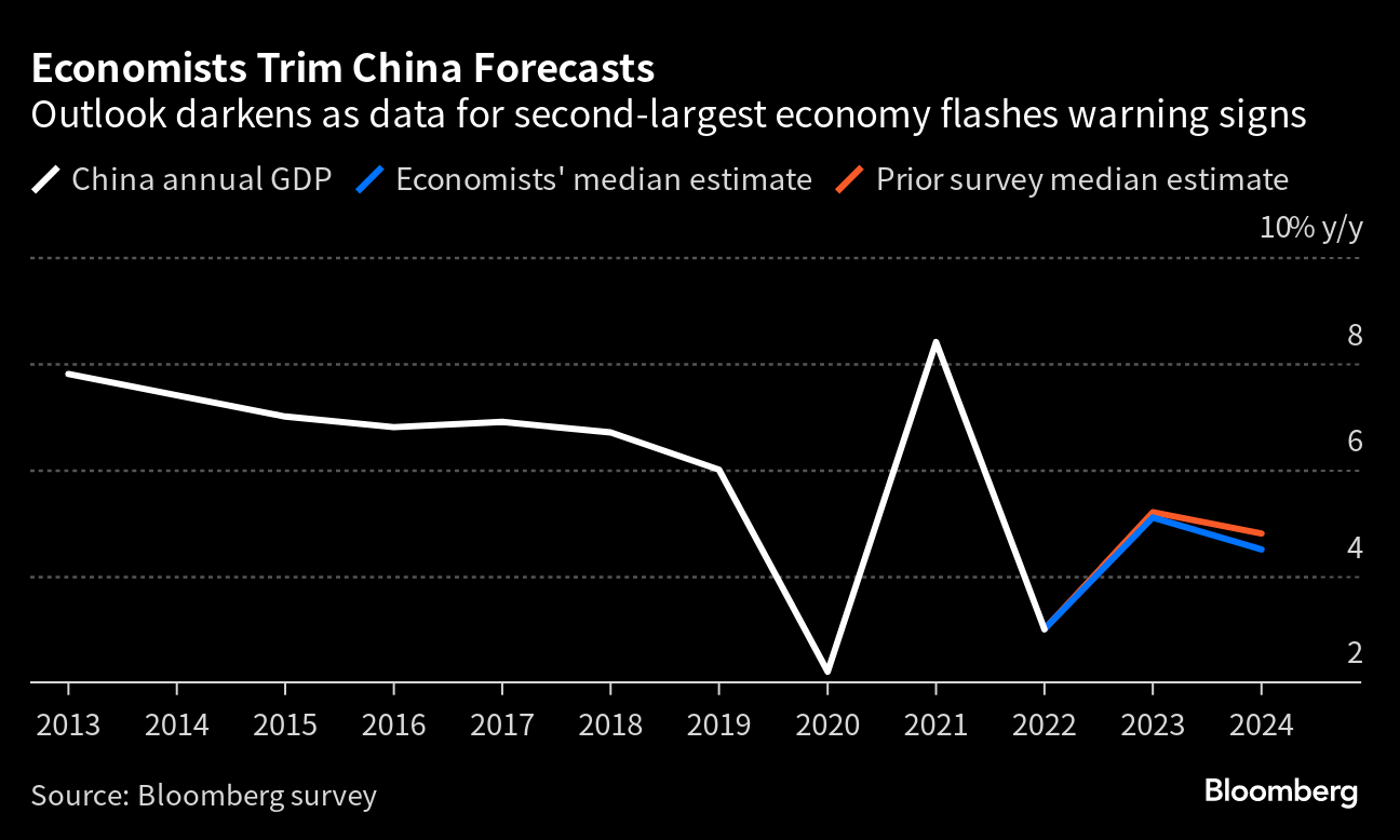 Economists now see gross domestic product expanding 5.1% in 2023 from the prior year, according to the median estimate in the latest Bloomberg survey. That's down from an earlier expectation of 5.2% and brings projections closer to the government's target of about 5% — a number widely seen as conservative when it was set in March.