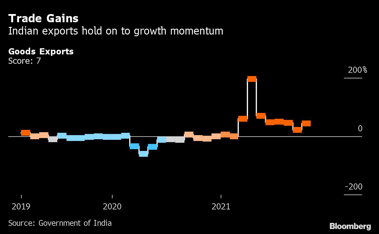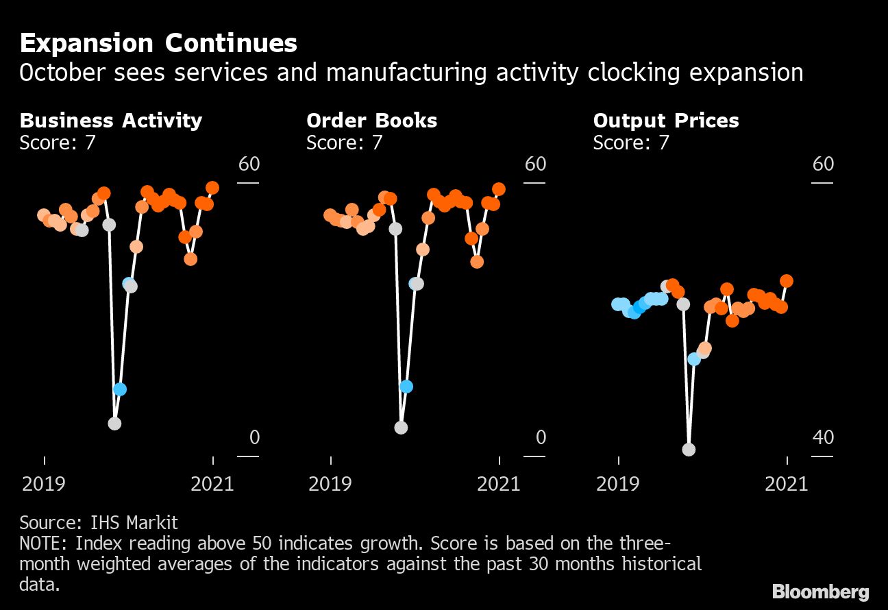 Demand during India's so-called festive season has helped keep momentum rolling, as shown by a fourth straight month unchanged at a 5 on the Bloomberg News ‘Animal Spirits' gauge of indicators, which uses a three-month weighted average to smooth out volatility in single-month readings. The measure reflects strength in services and new orders last month, as well as a rebound in exports.