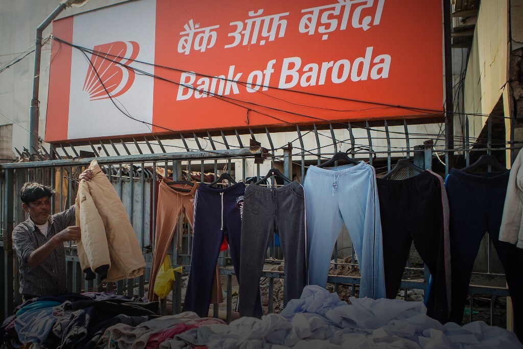 A vendor arranges his clothing stall below a sign for the Bank of Baroda in New Delhi, India. (Photographer: Prashanth Vishwanathan/Bloomberg)